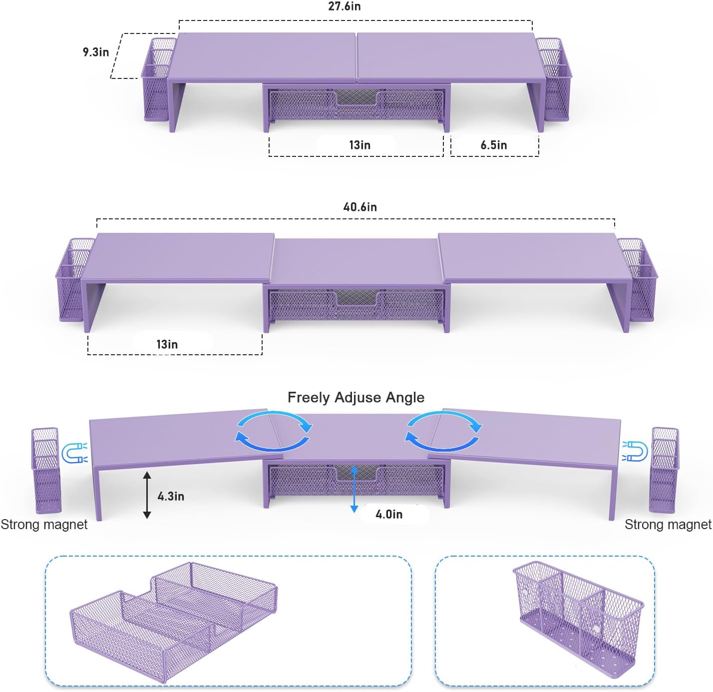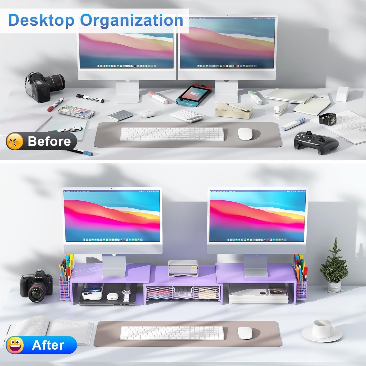 【Ample Storage Space】The dual monitor stand features two magnetic pen holders and a drawer, allowing you to easily organize your desk accessories and office supplies, keeping your workspace clear and tidy for easier access.
