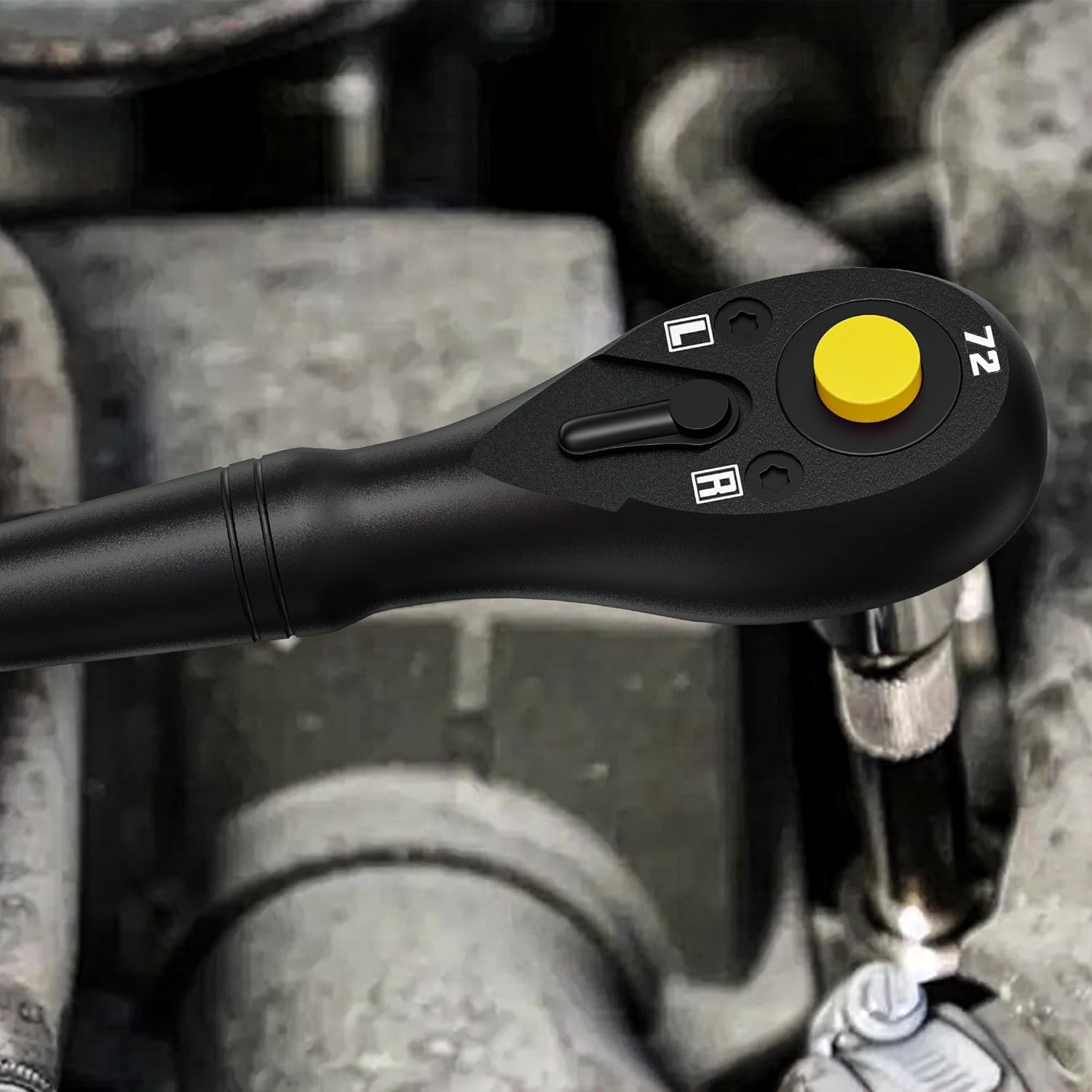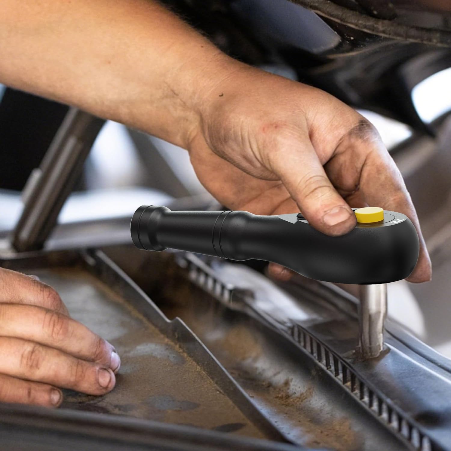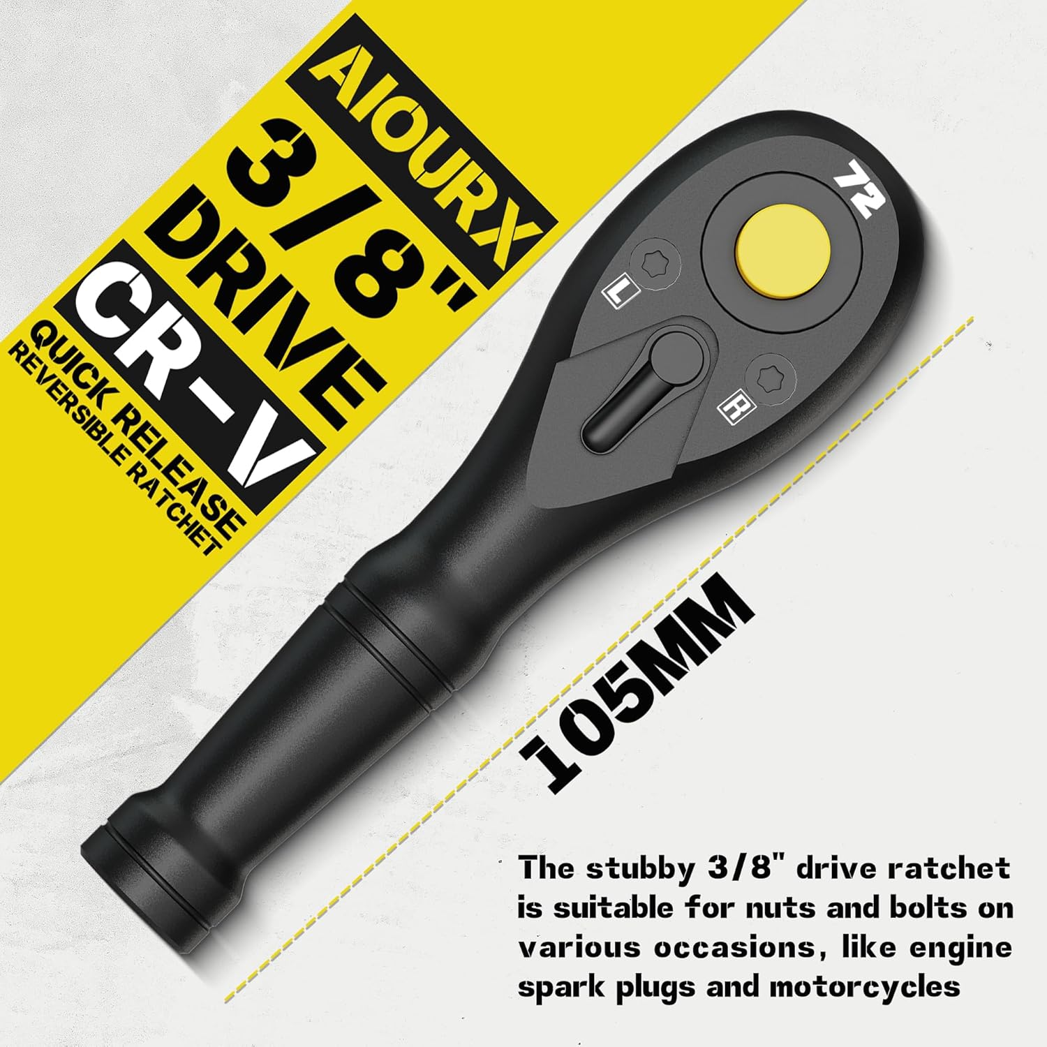 The stubby 3/8" drive ratchet is suitable for nuts and bolts on various occasions, like engine spark plugs, and motorcycles. Its mini size ensures easy maneuverability in tight spaces, ideal for reaching cramped, hard-to-access areas