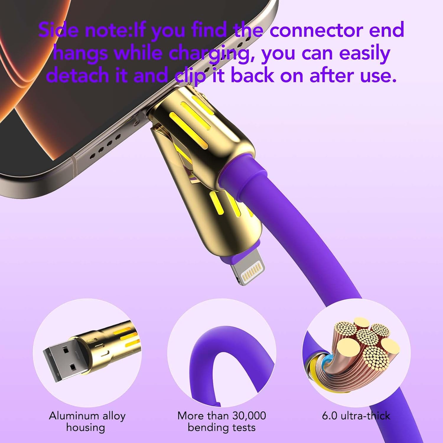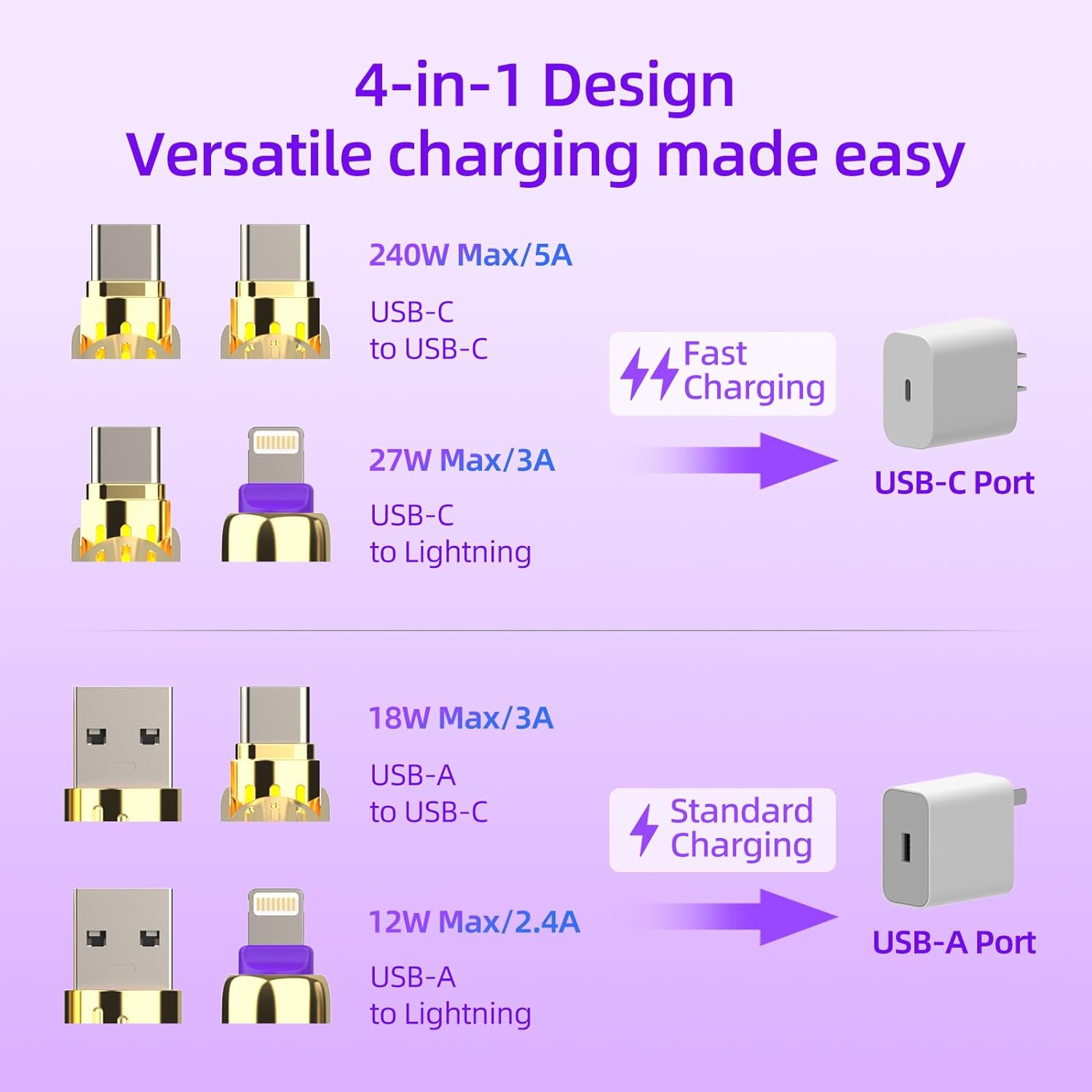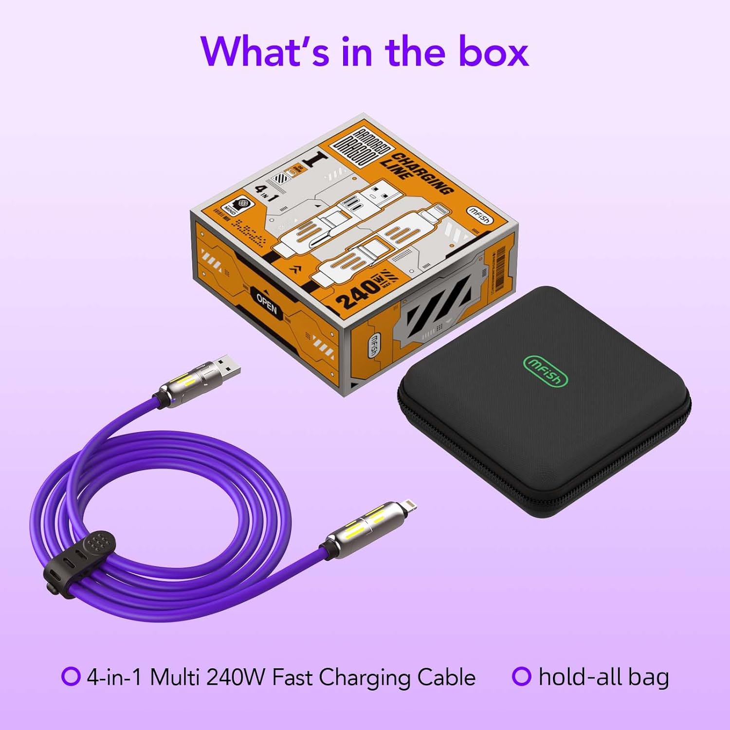 All-in-One Charging Solution – Simplify Your Life : No more messy cables or forgotten adapters. The MFish 4-in-1 USB Cable has every connector you need: USB-C to USB-C, USB-C to Lighting, USB-A to USB-C, and USB-A to Lighting. Charge most of your device—from the iPhone 16 series and iPads to Samsung Galaxy phones, MacBooks, laptops, and more—with a single, sleek cable. Perfect for travel, work, or just decluttering your tech drawer.
