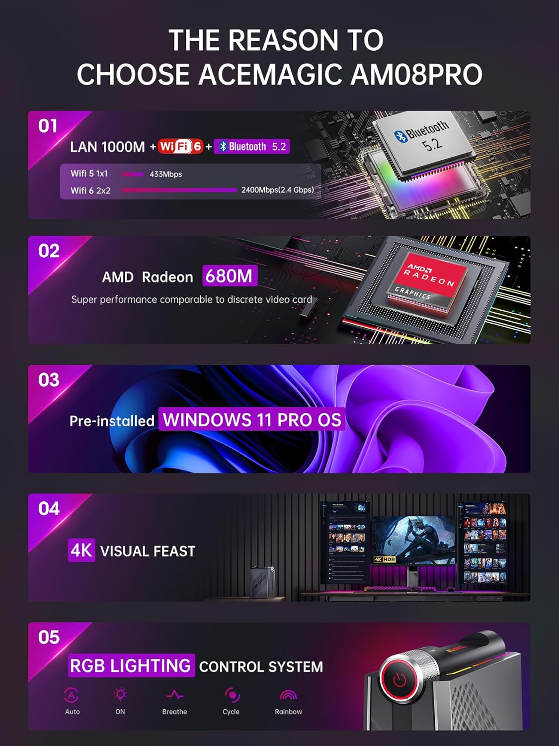 【Fight for Speed, Say bye to Delays】ACE mini gaming pc--Equipped with WiFi 6(802.11ax) can cover 2.4/5GHz, about 2.5 times faster than WiFi 5 and the transmission speed is up to 9.6Gbps& low latency & more stability. Bluetooth 5--Bluetooth 5.2 improves transmission speed and increase effective working distance, allowing the mini computers more quickly to connect other wireless devices (headset, mouse, keyboard, etc.). Adopts 2.5Gbps LAN port, 3 times than the traditional Gigabit network. AM08PRO micro pc has pre-installed Wins11 pro, and also supports Linux, Ubuntu, and is also very suitable for developers and programmers to run dual customized operating systems.