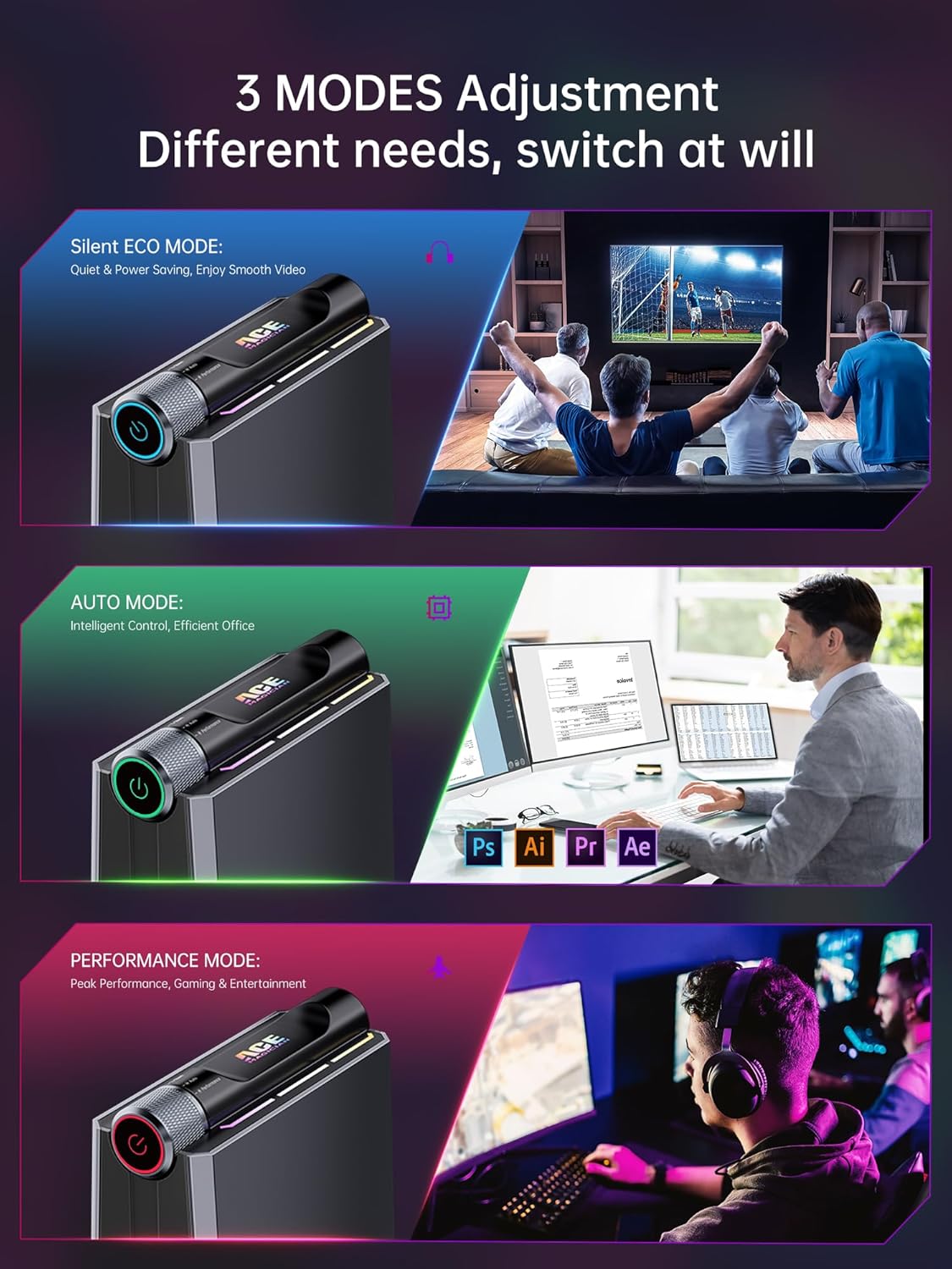 【Multiple Modes to Meet Different Needs】Take your gaming to the next level with our multi-mode desktop computers and enjoy smart energy-saving features. ① Silent mode, fan sound as low as 35db and the power of mini pc is reduced to 20-30W, enjoy quiet streaming or light work; ② Auto mode, suitable for medium work or entertainment projects, the mini computer power is setting as 30-40W, improve your work efficiency; ③ performance mode, you can crank up the power to 40-55W to glide thru the toughest and most intense game graphics, upgrade your gaming experience. The adjustable mini pc RGB lighting effects provide a full range of atmosphere and inspire your enthusiasm for challenging games!