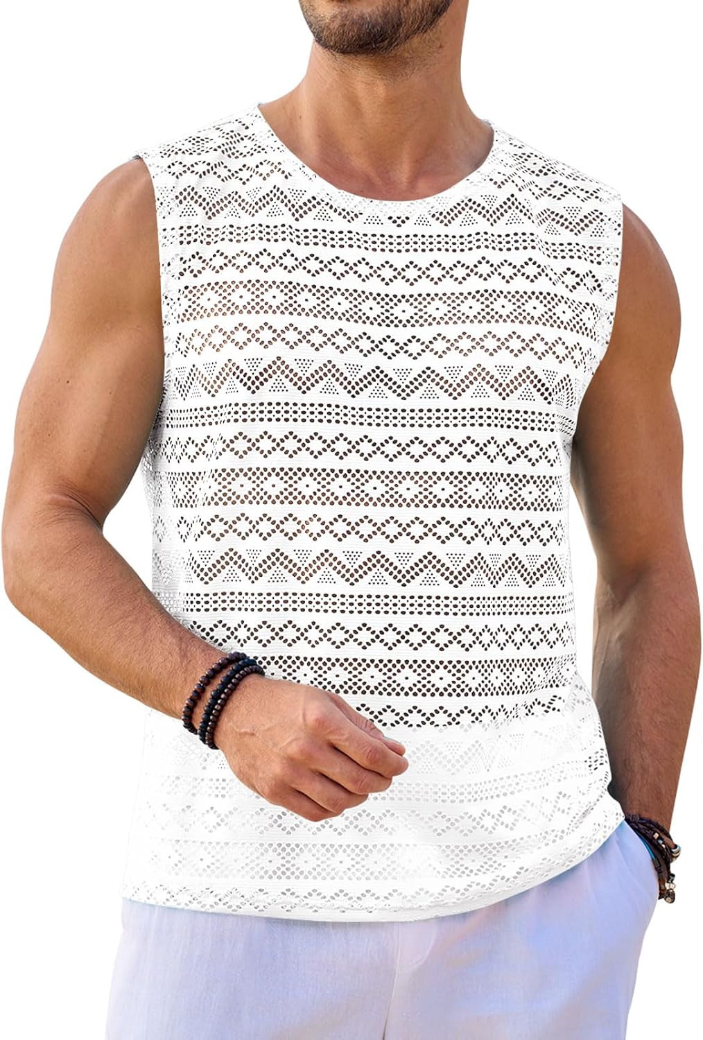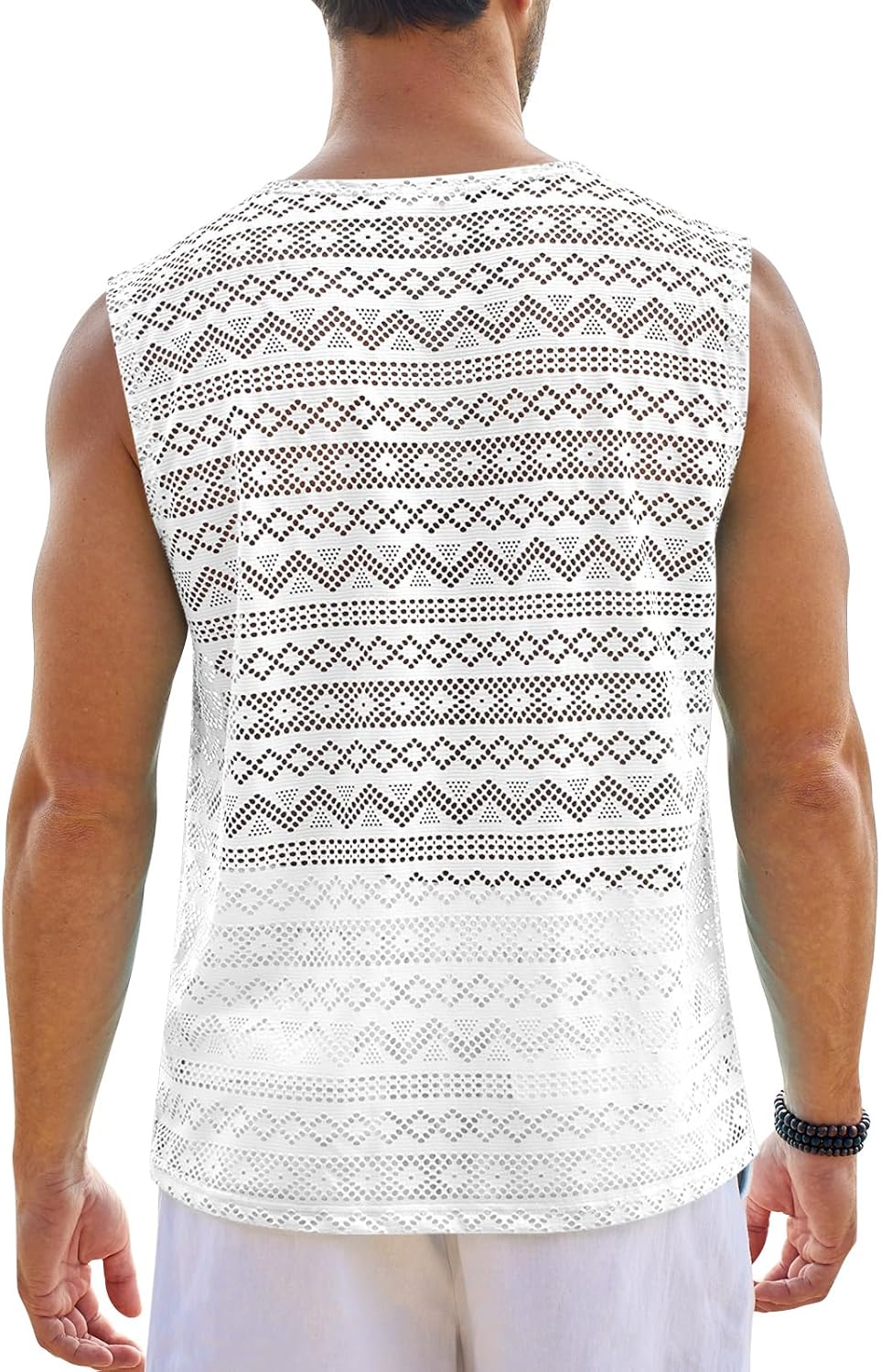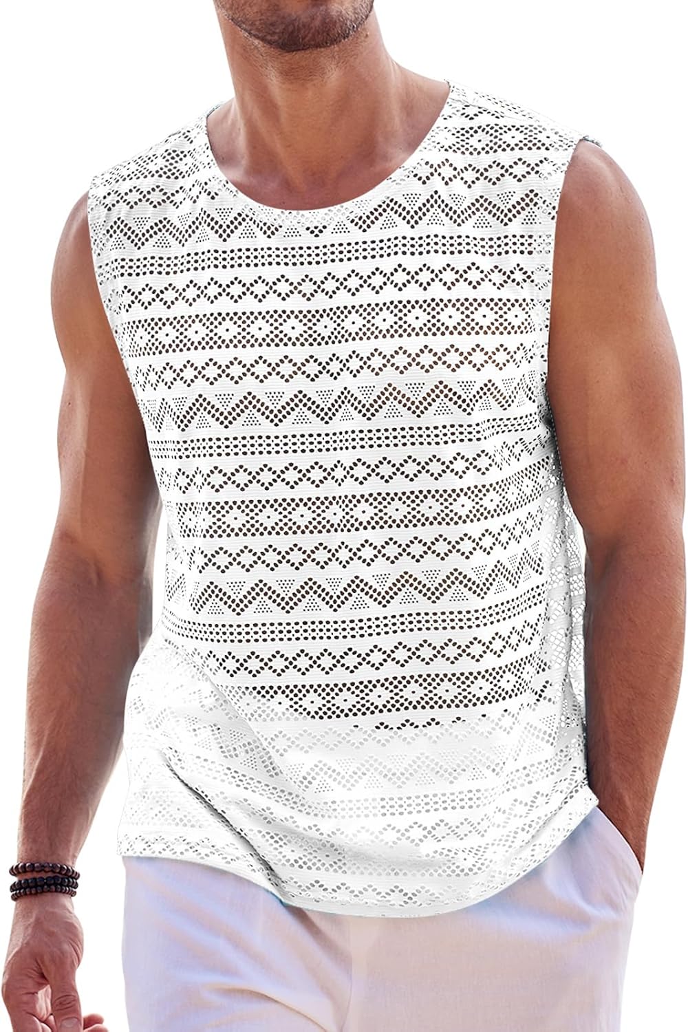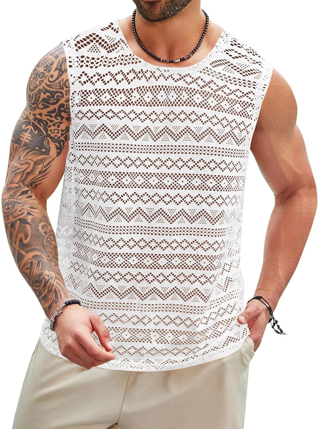 Design: Crew neck and sleeveless, see through sheer design, Aztec-like texture.