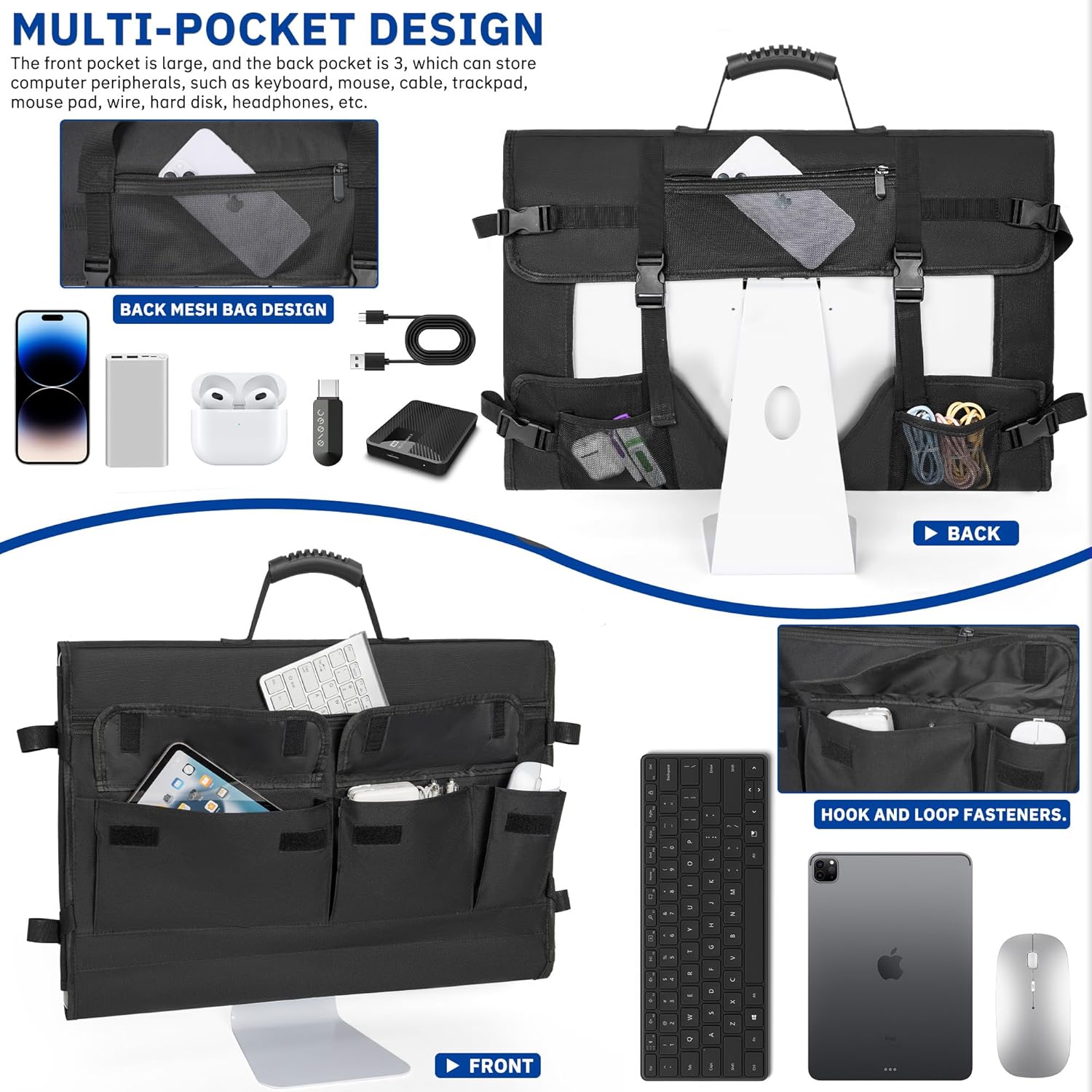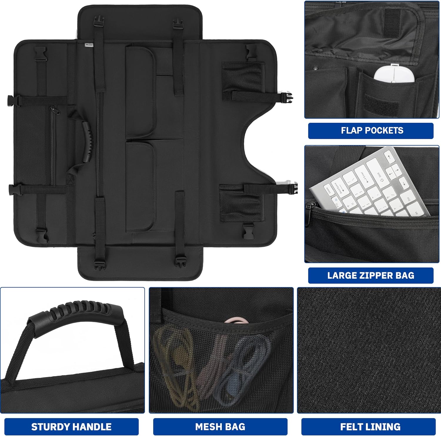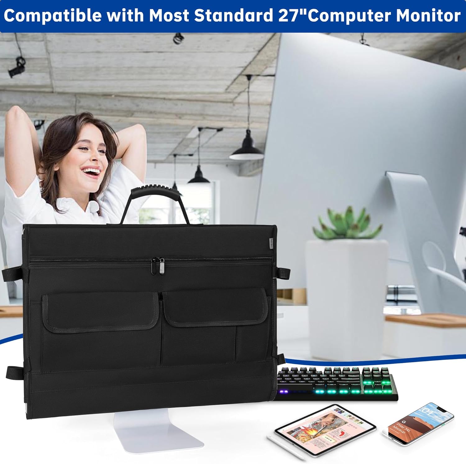 【Multiple pockets and large space】The monitor bag has 6 extra pockets, which can store all your computer accessories, such as keyboard, mouse, trackpad, USB power adapter, charging cable, headphones, mouse pad, power cord, external Hard drives, CD-ROM drives, etc