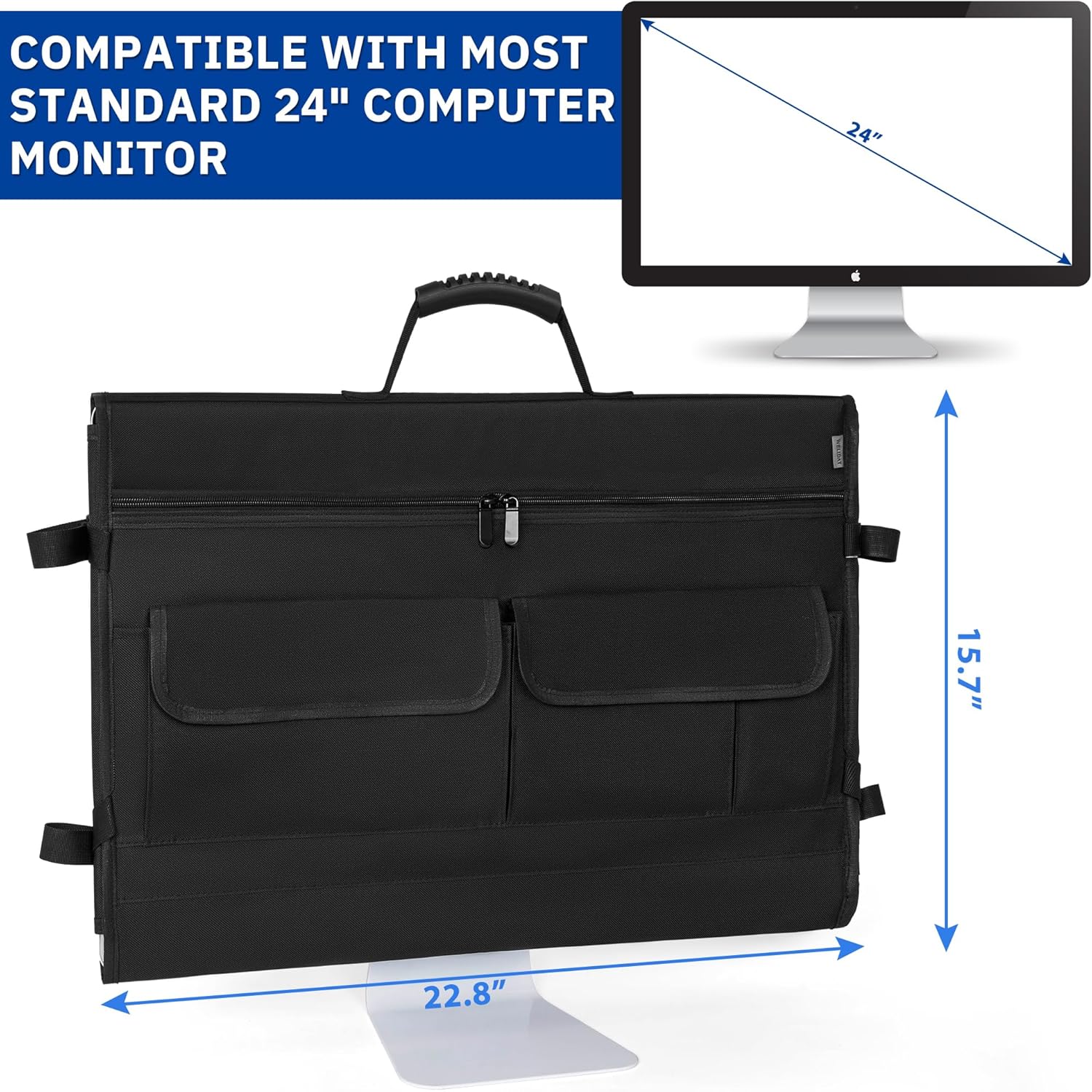 【24" Monitor Case】WELIDAY computer monitor case is designed to fit 24" monitors/screens and is compatible with iMac 24" monitors. Maximum size that can be accommodated: 22.8 X 15.3 Inches. Please confirm your monitor size before purchasing