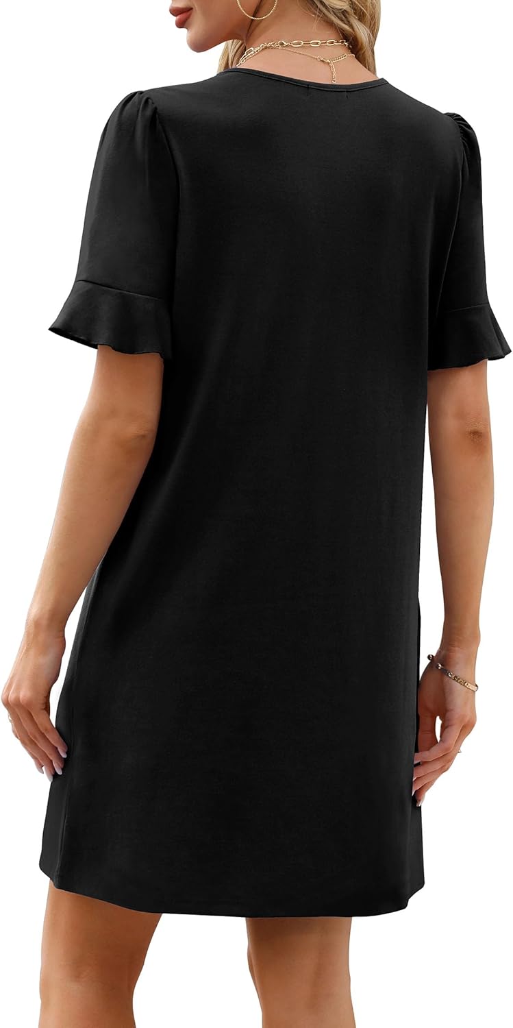 OFEEFAN Summer Dresses for Women Ruffle Short Sleeve V Neck Casual Shift Dress with Pockets