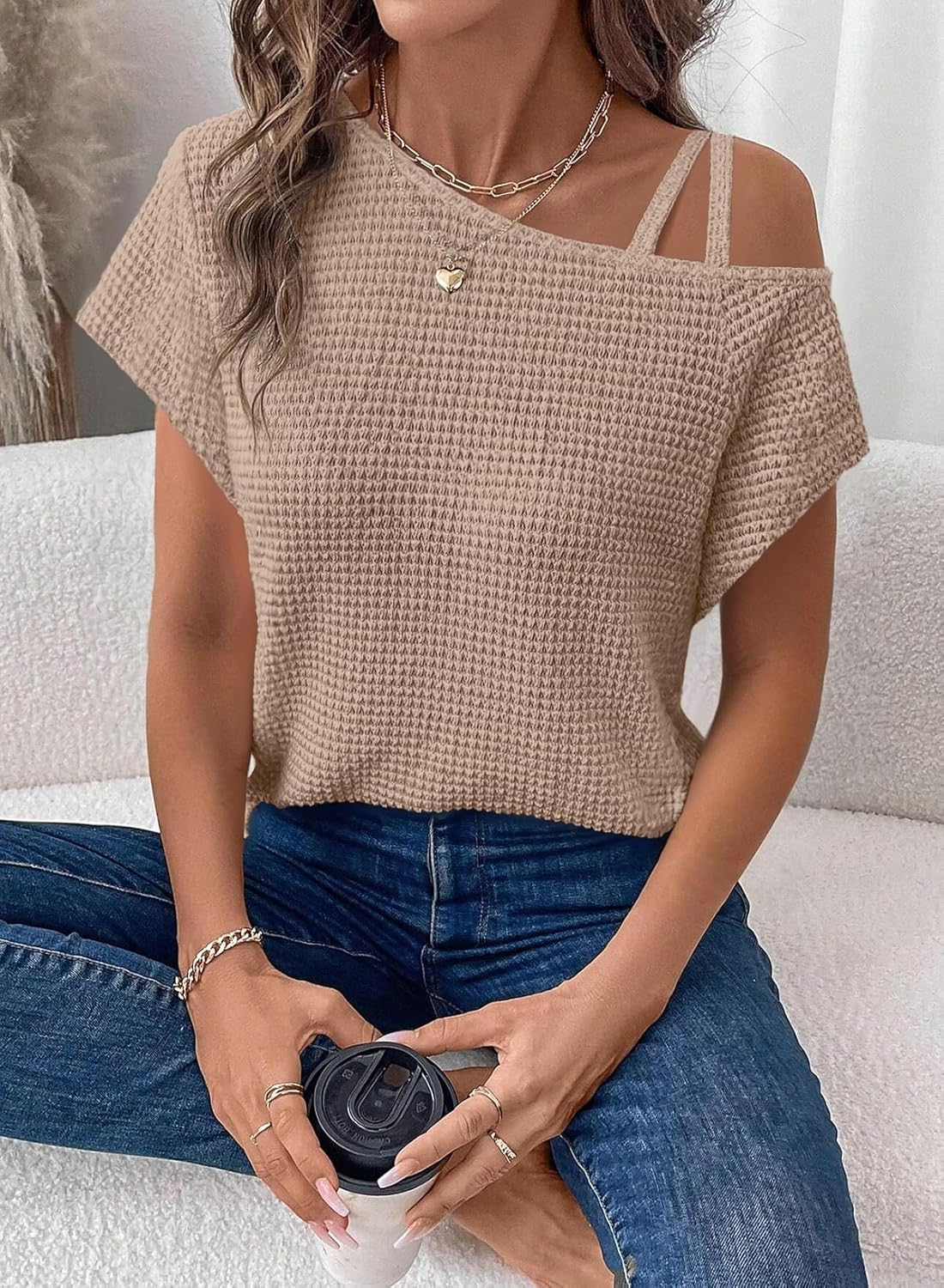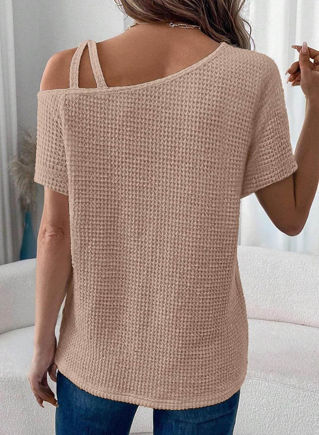 Features: Dokotoo womens tops feature with Waffle Knit, Short Sleeve, One Shoulder, Cross Straps, Asymmetric Collar, Lightweight Knitted Fabric, Slight Stretch, Solid Color, Casual and fashion style fits for any body shape, and a t-shirt necessary for women wardrobe.