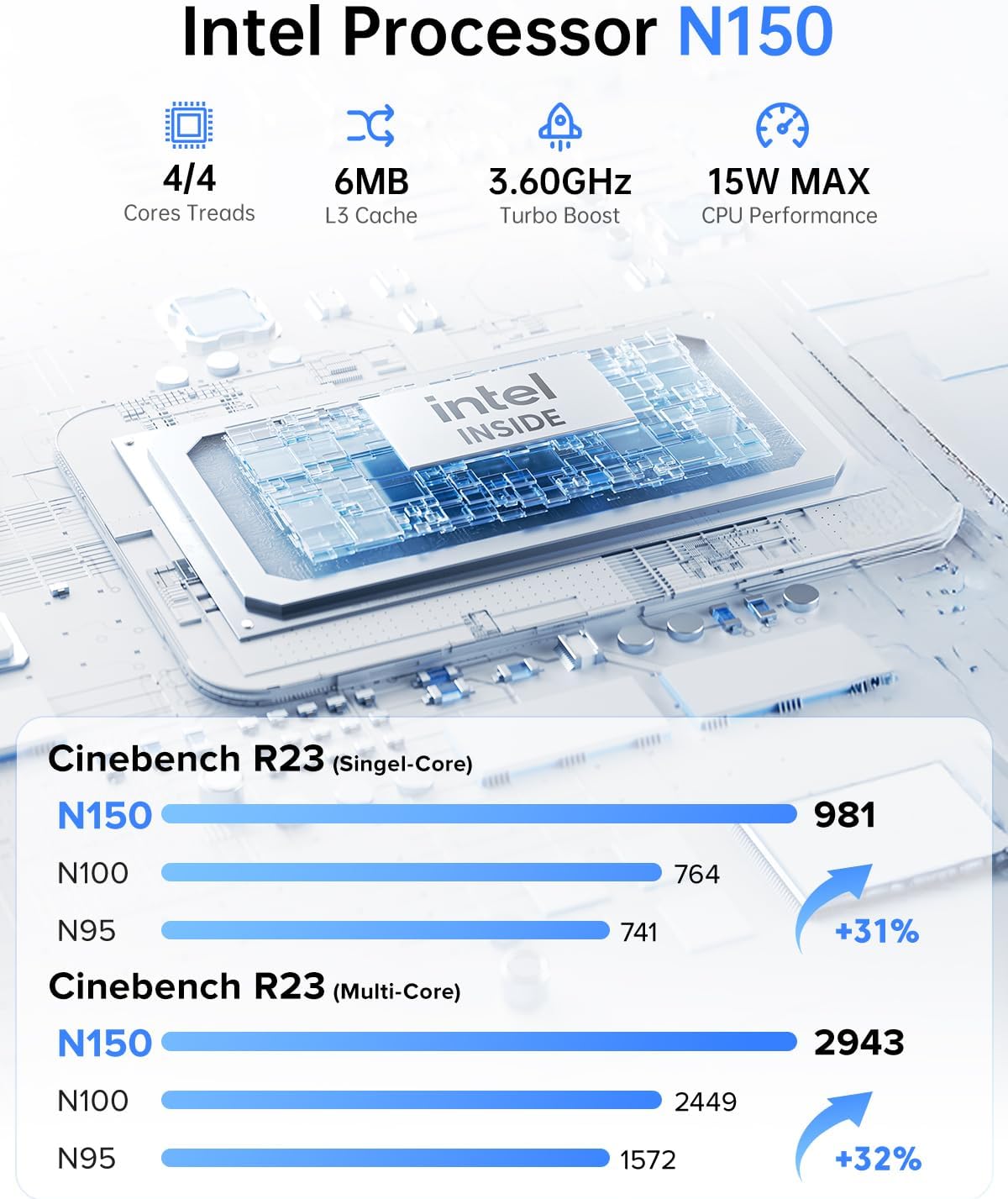 ??[New Release CPU: N150,which is faster and more powerful than the N100/N95] - ACEMAGIC Vista Mini V1 is powered by 2024 Latest In-tel Processor Twin Lake N150(4Cores/4 Threads, 6M In-tel Smart Cache, 0.8GHz, MAX TO 3.6GHz) , delivers more than 39% higher performance than N100(Reference from Cinebench R23). Performance at least +40%, GPU at least +23% compared with the previous CPU - N95/N5105/N5095. Remarkably power-efficient at 15W, it outperforms its predecessors, even rivaling some mainstream mobile processors from the past