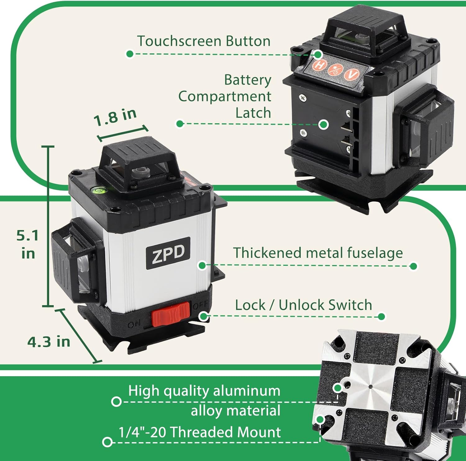 [Greater Visibility & High Accuracy]: Our green laser level uses latest technology, which is 3 to 4 times brighter than the traditional red laser beam, achieve precise measurements with an accuracy of ±1/25 inch at 32ft, the 4D laser level provides all-around leveling coverage and a maximum working range of 66 feet. ZPD lazer leveler tool can be work with the laser receiver, suitable for indoor & outdoor