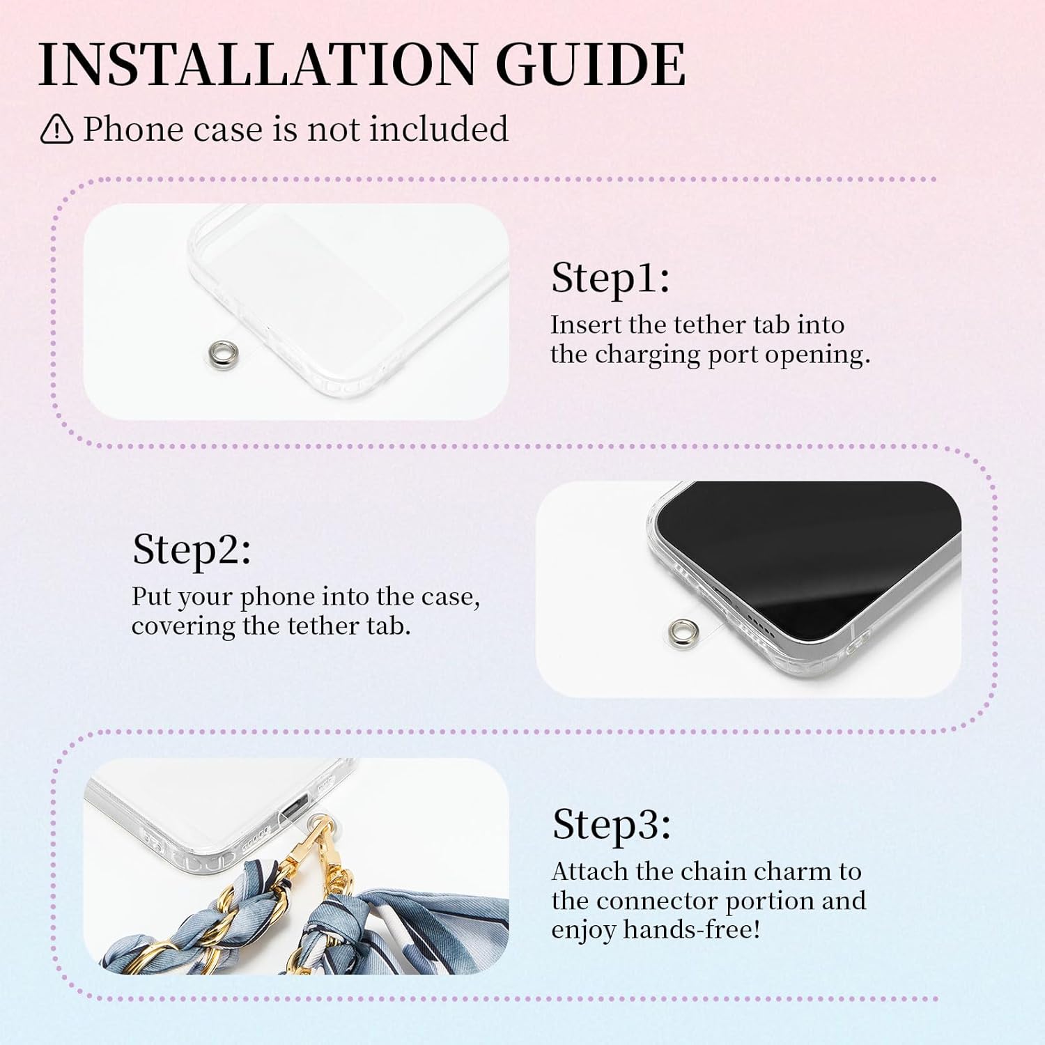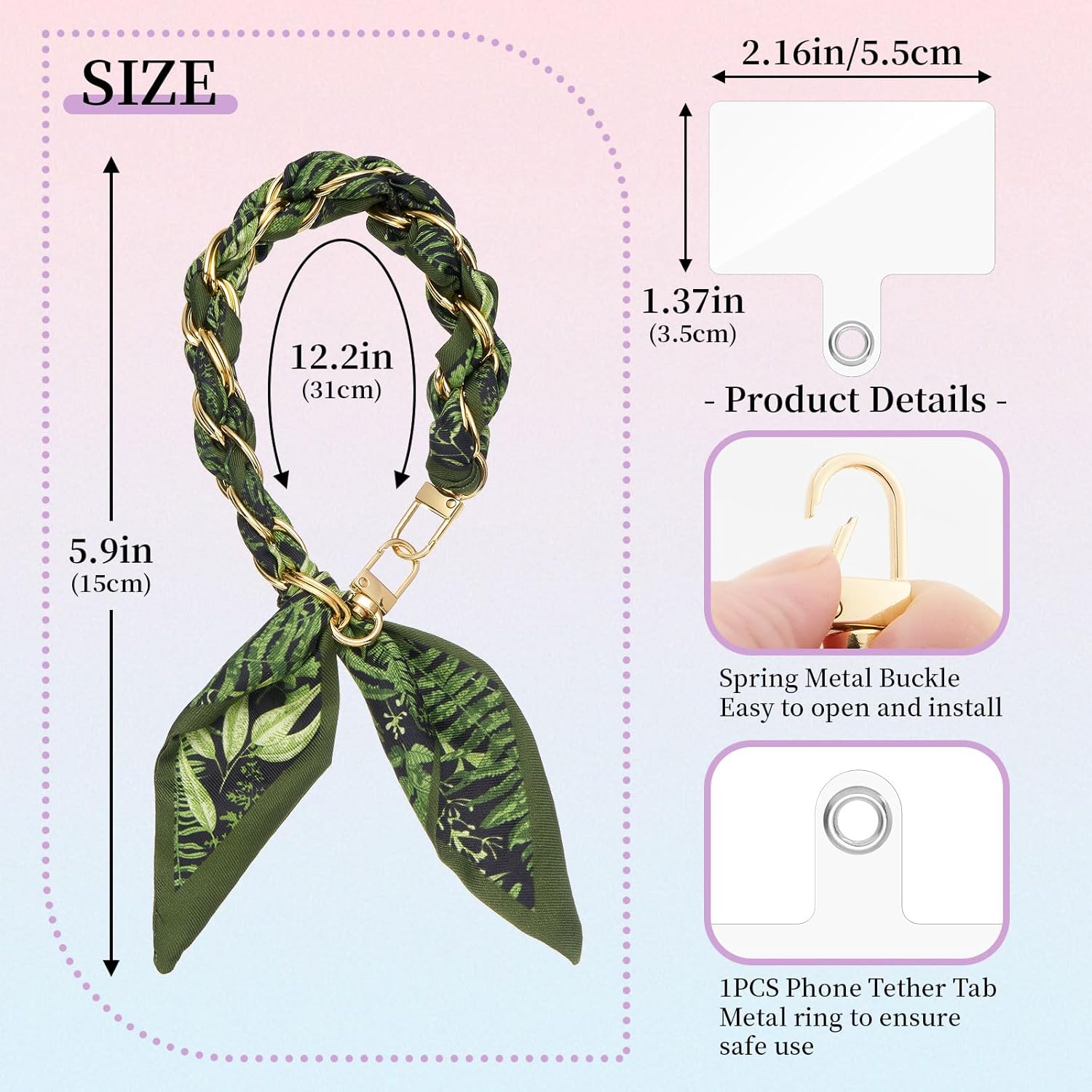 ORDER INCLUDES - 1 Universal Transparent Tether Tab; 1 like silk feel Gold Metal Scarf Phone Wrist Chain (Total Length is about 12.59 inches/32 cm)