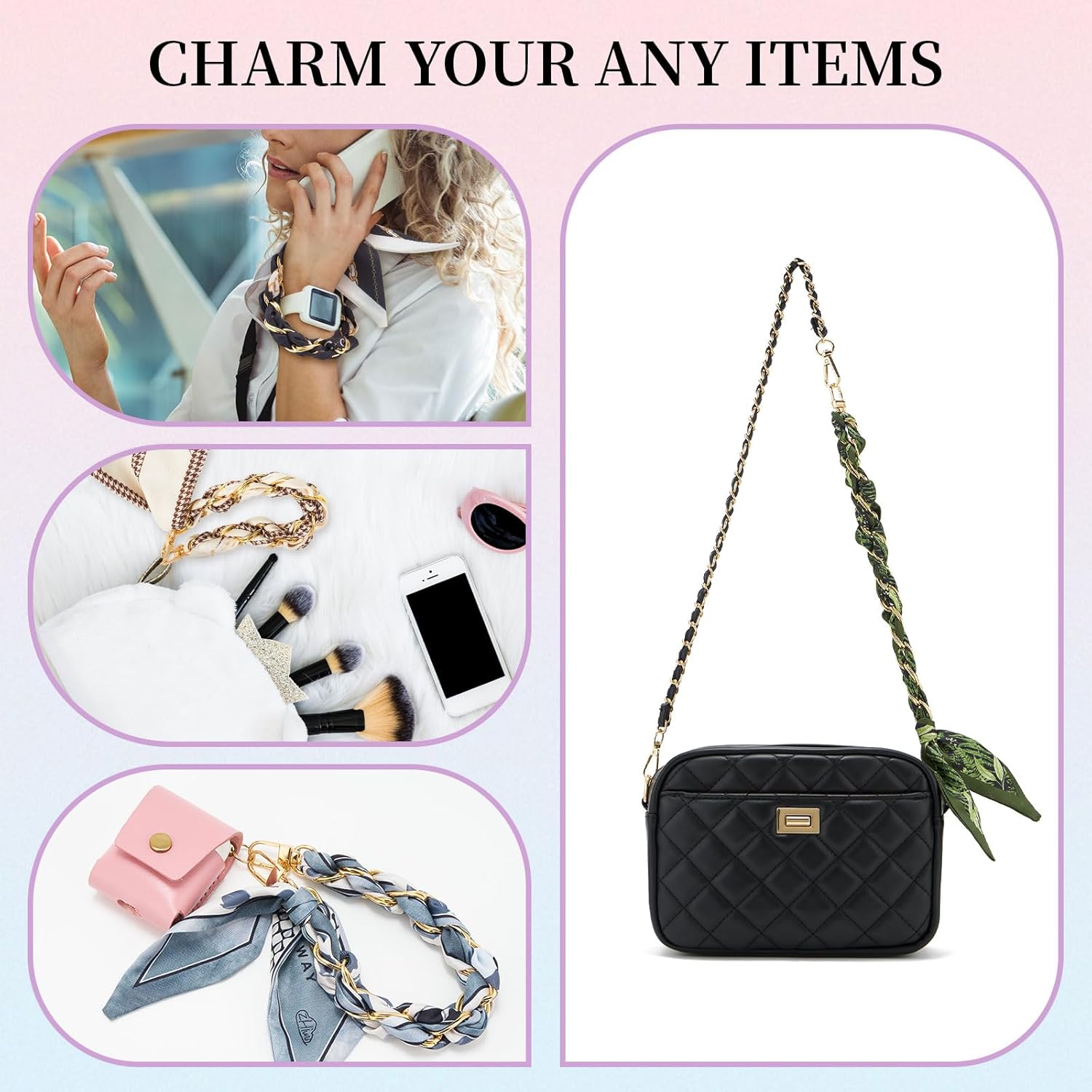 CLASSIC DESIGN - The clever combination of soft like silk scarf and exquisite metal chain brings a unique sense of fashion. Whether used as a cell phone charm strap, purse accessories, or a handbag charms, it can add a bright embellishment to your daily look