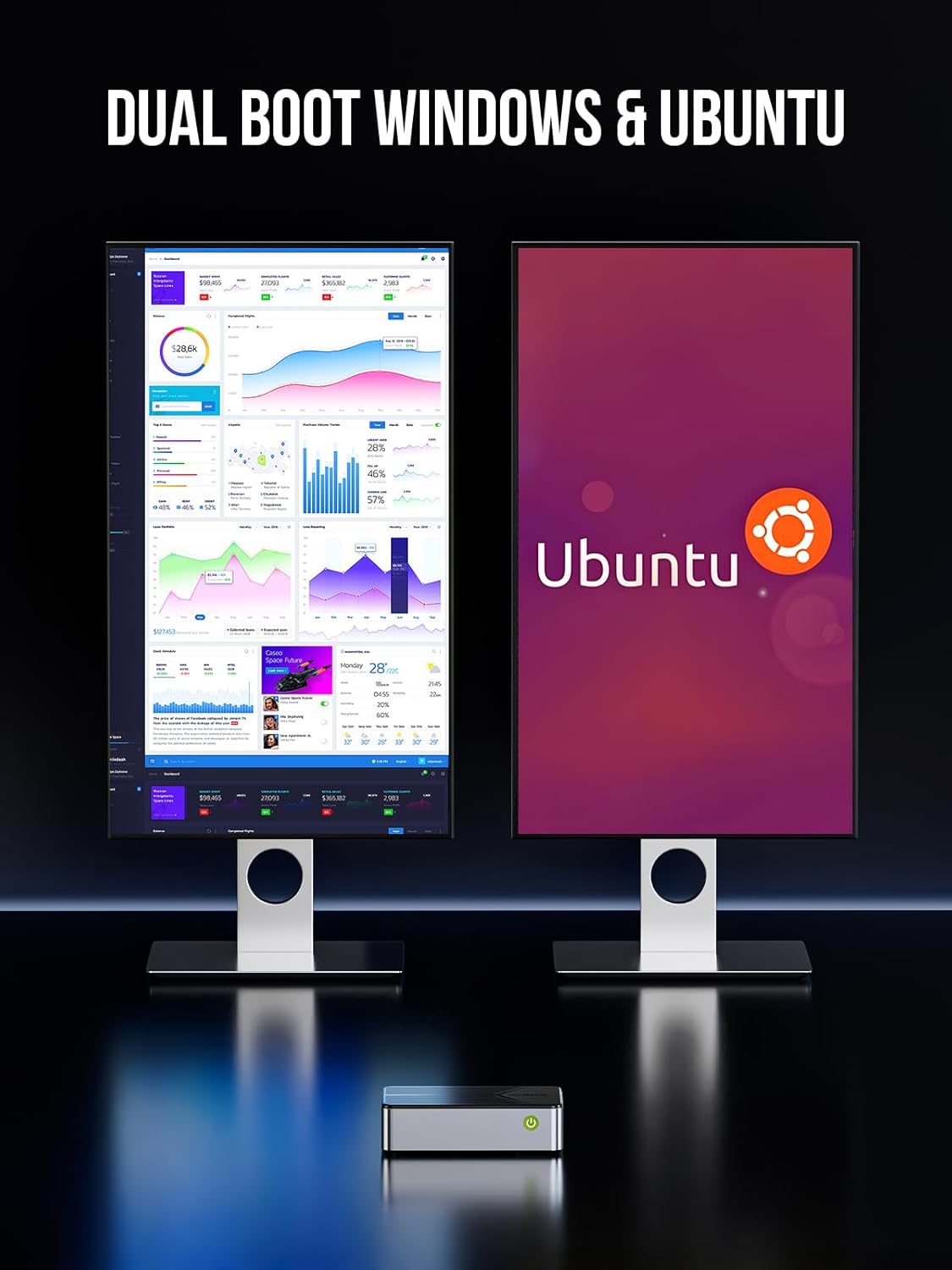 DUAL BOOT UBUNTU & WIN 11 PRO - The G9 mini pc desktop computer is pre-installed with Win 11 Pro (Default OS) and Ubuntu 24.10 Version (Linux Software must be 24.10 Ver. or Higher). The Ubuntu OS is stored on 64GB EMMC Storage and Win 11 Pro is installed on the SSD.