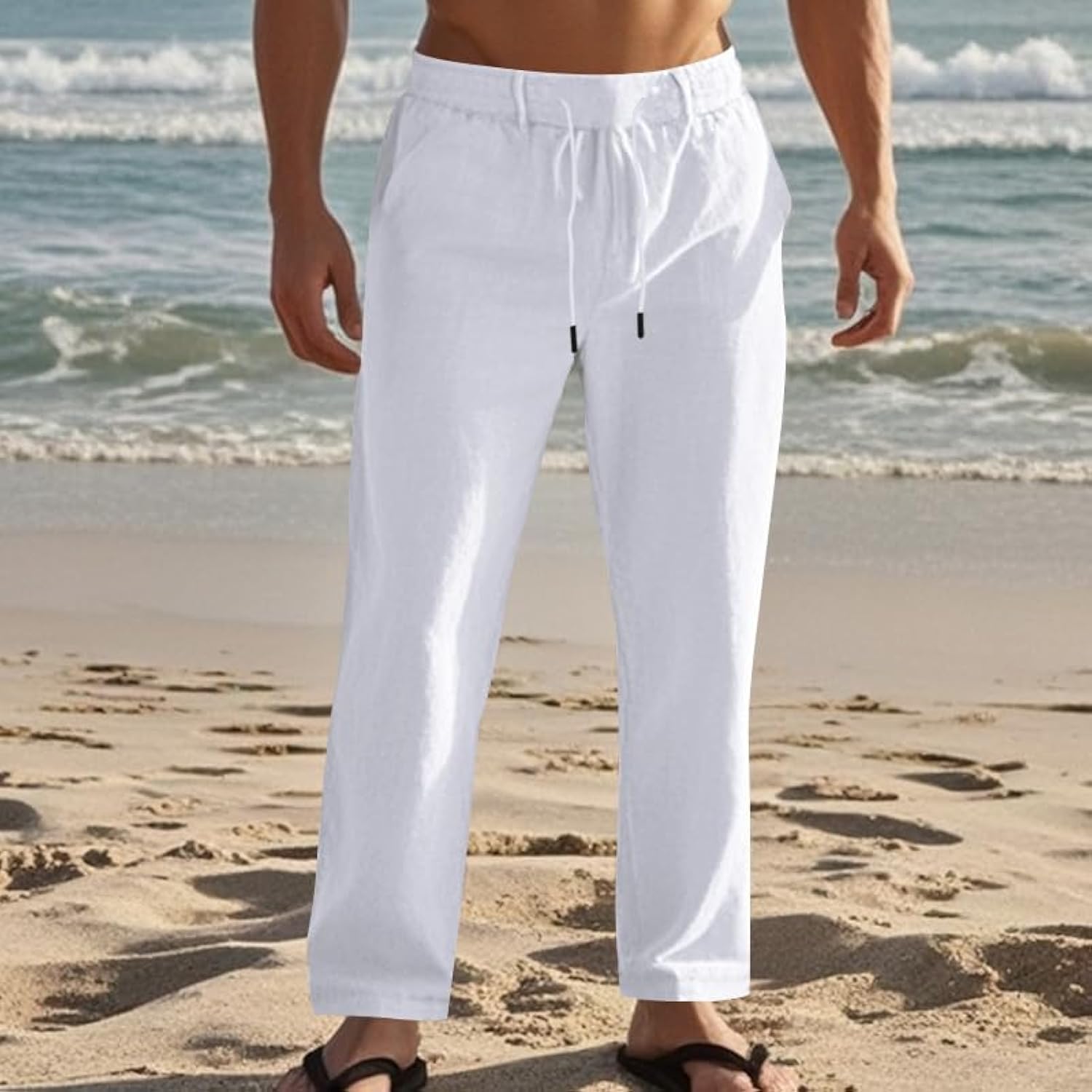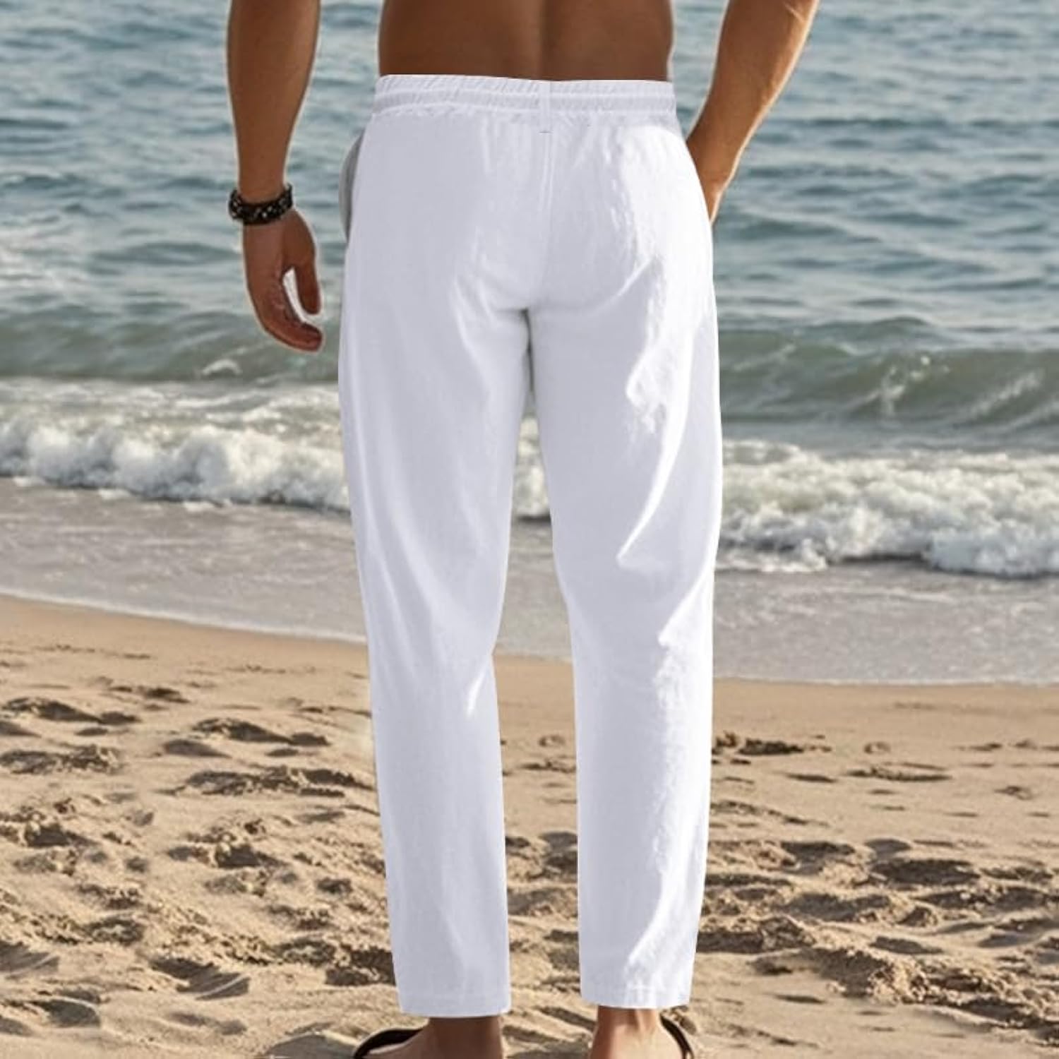 Design: Elastic waist drawstring linen pants , men's yoga beach pants with 2 side pockets , straight-leg summer trousers, simple and stylish.