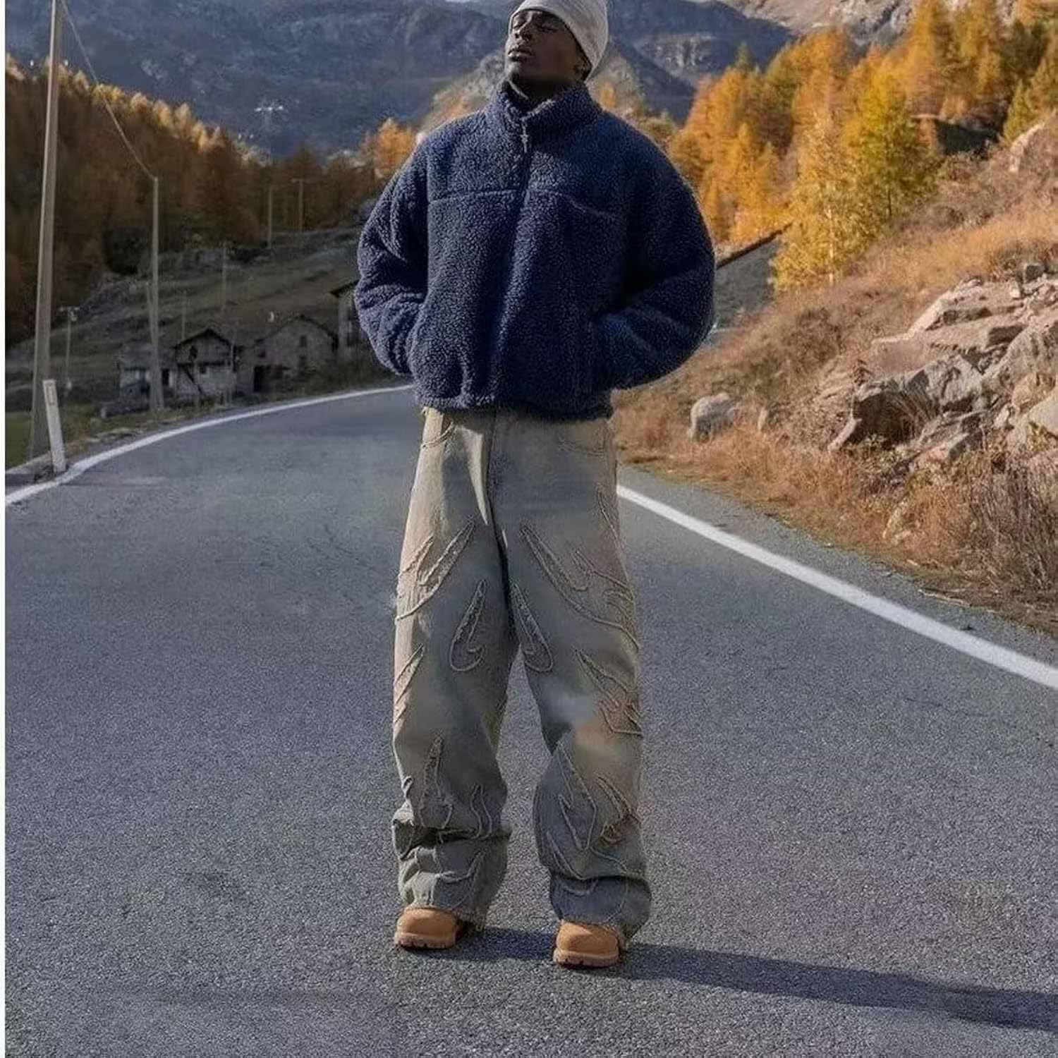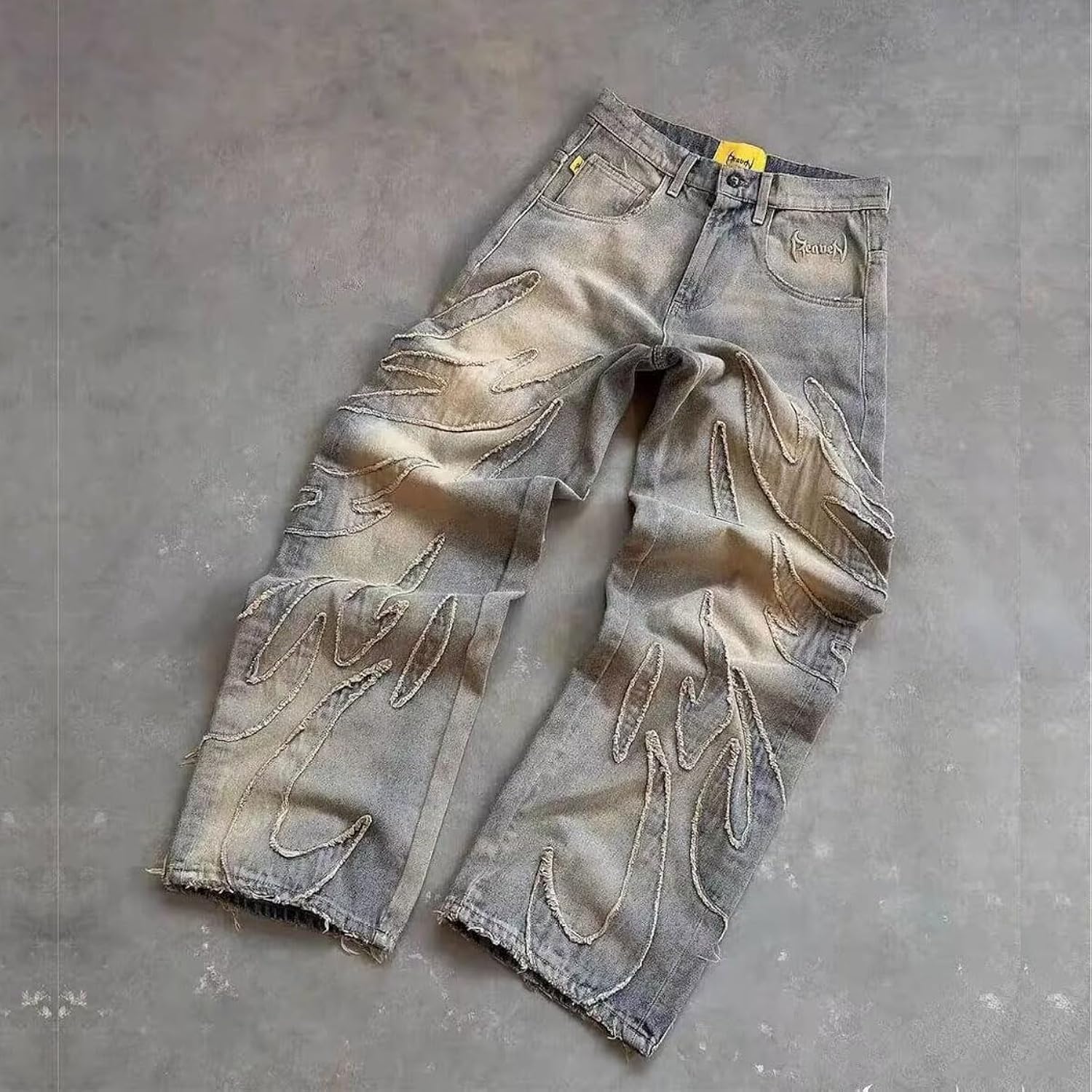 Design: y2k men's jeans are made of washed and old denim fabric, with flame embroidery pattern design, loose straight cut silhouette, and street hip-hop Gothic style.