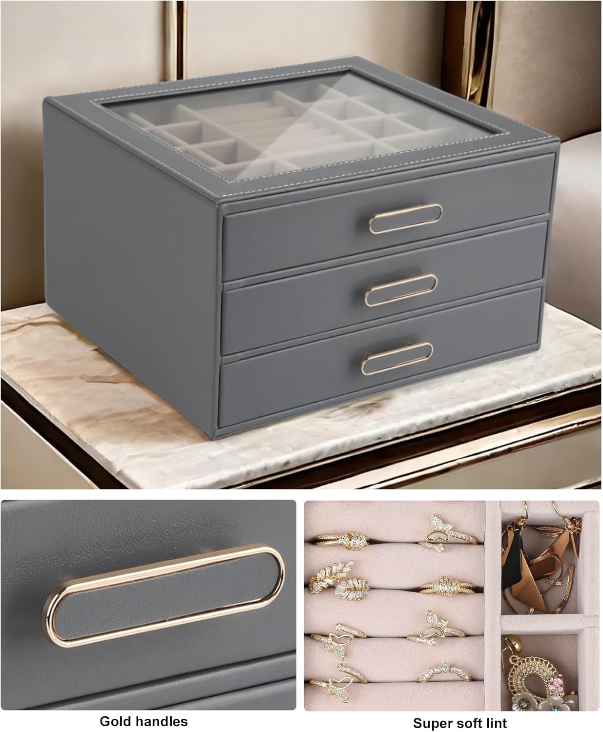 Modern Elegance Meets Sustainable Craftsmanship:Crafted with premium eco-friendly PU leather , luxe velvet lining, and a sturdy 3mm density board, this jewelry box exudes modern sophistication. The gold-tone metal handle—both functional and decorative—adds a touch of glamour, making it a seamless fit for contemporary vanities, minimalist dressers, or boho-chic nightstands. Durable, stylish, and planet-conscious: storage that looks as good as it feels