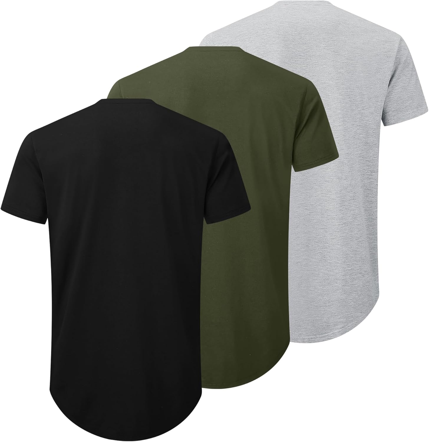 Mens 3 Pack Plain Cotton Shirts Short Sleeve Casual Crew Neck T-Shirts Hipster Hip Hop Longline Tees Drop Cut Curved Hem