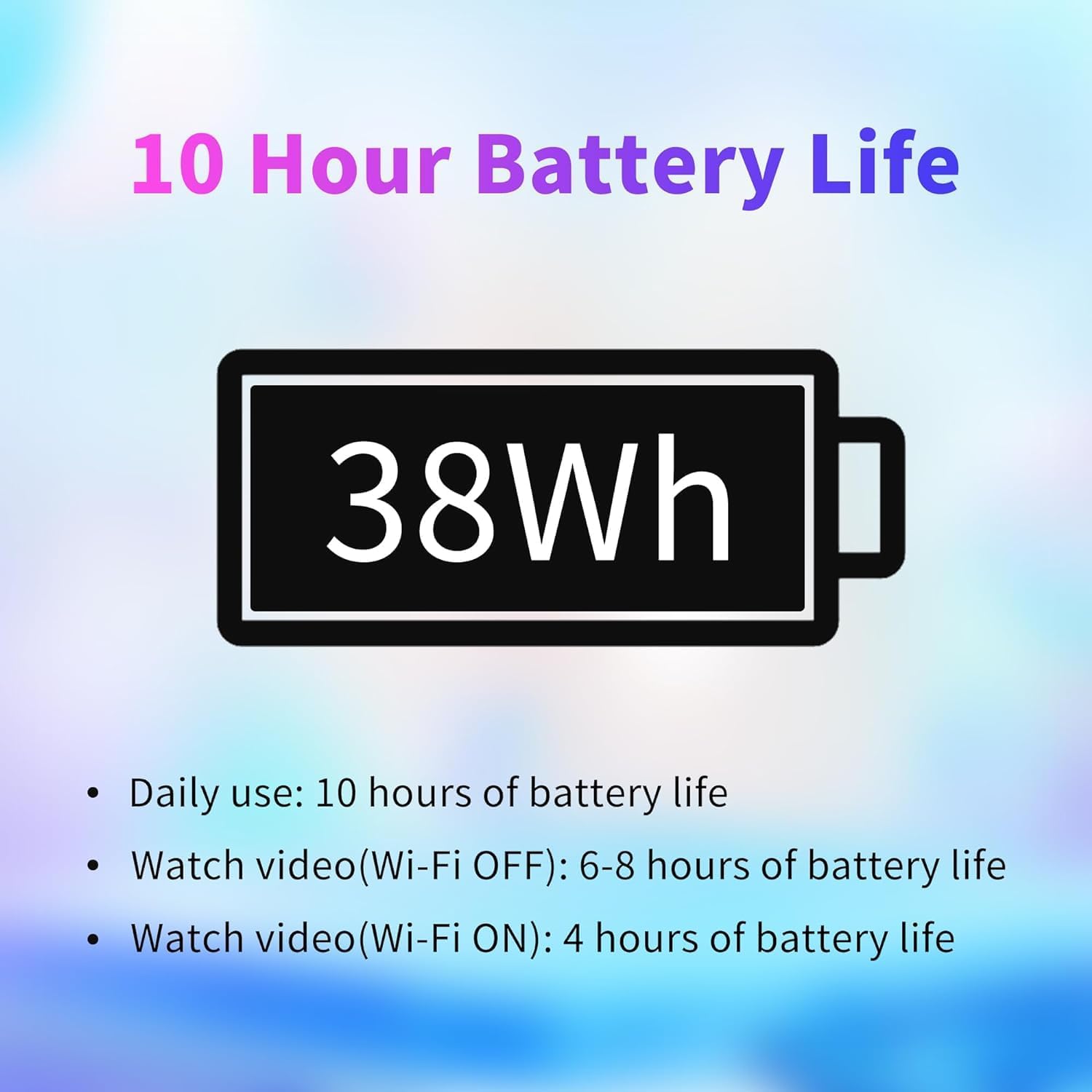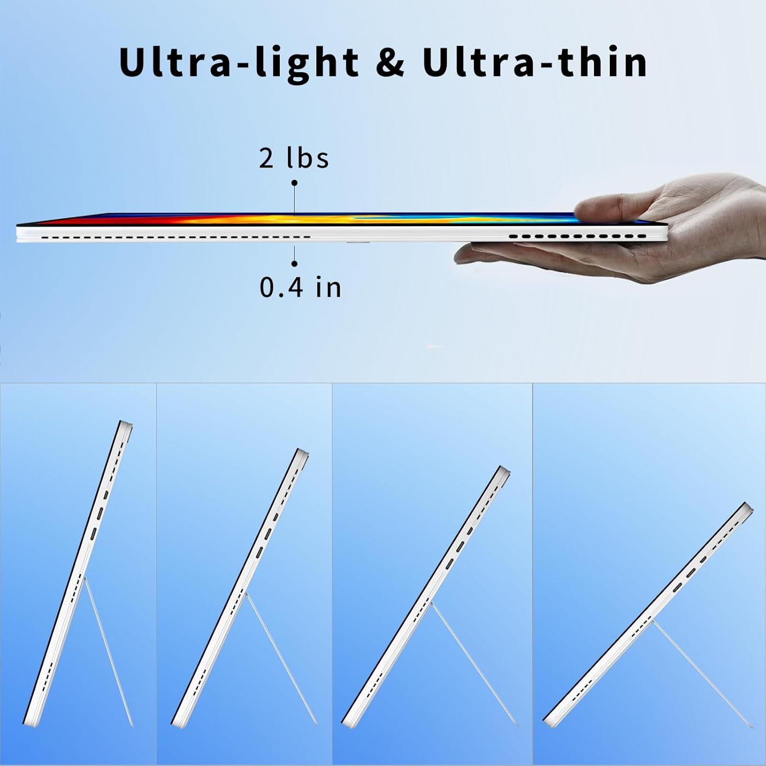 Weight 2 pounds, thickness 0.4 inches. Battery life over 10 hours and can play videos for 8 hours.