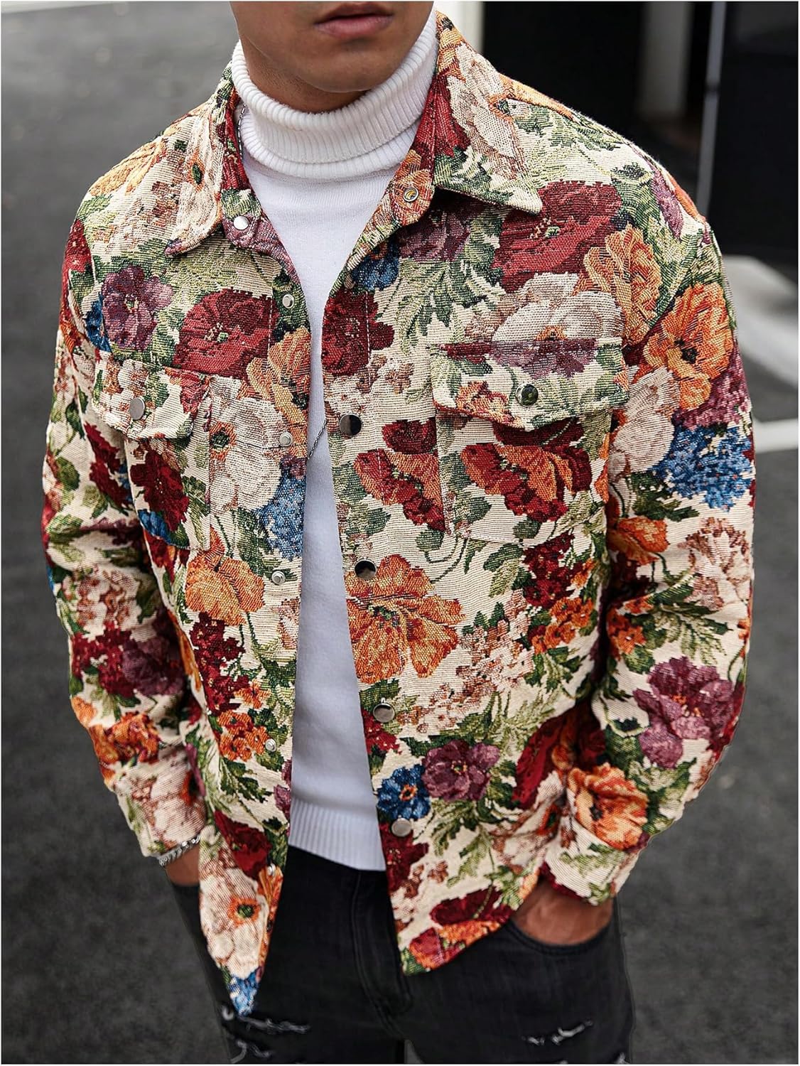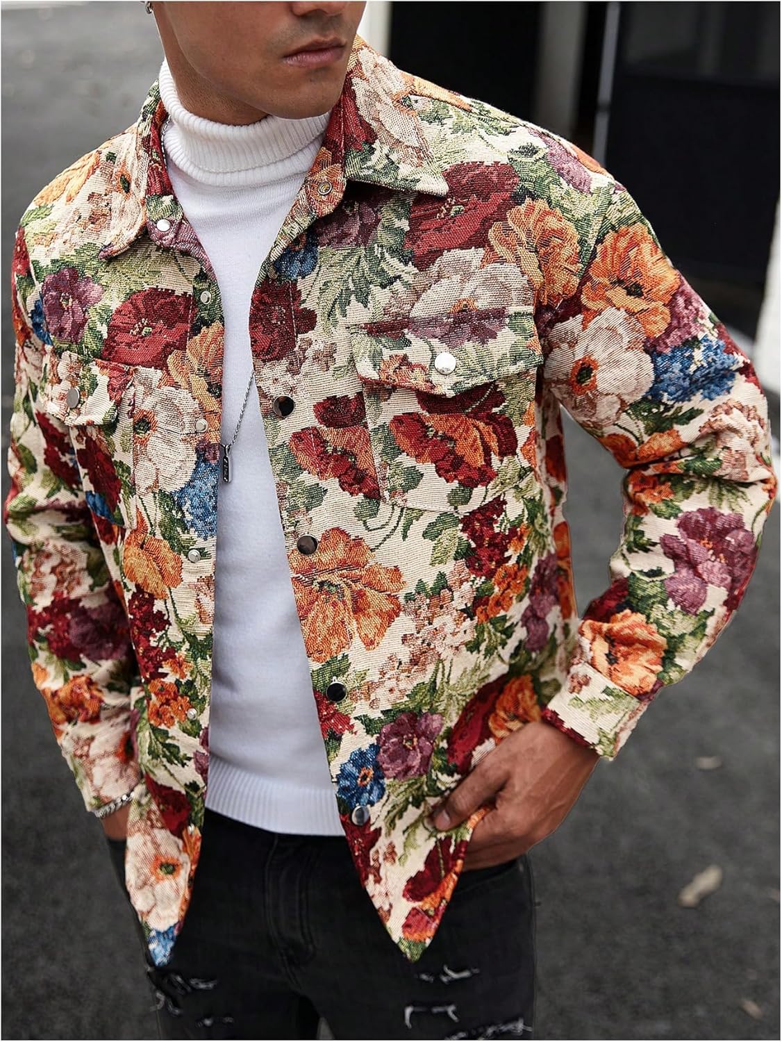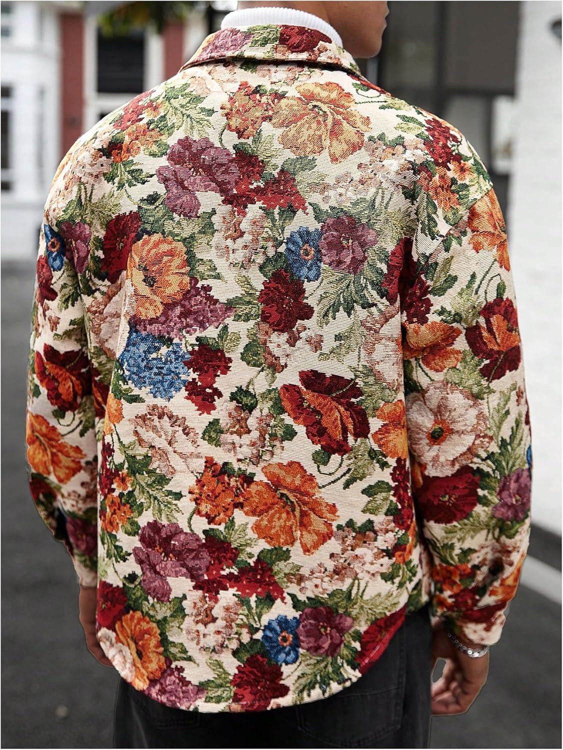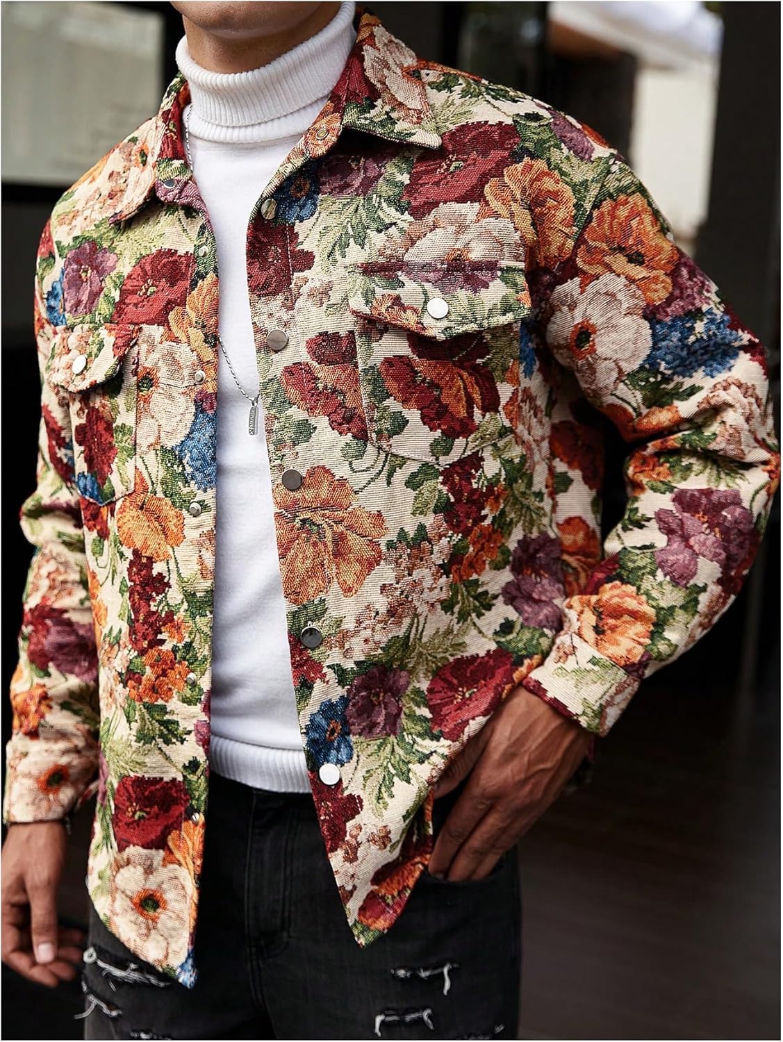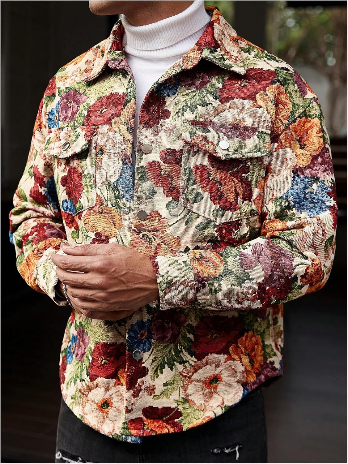 Feature: Floral print, long sleeve, button up, collared neck, casual jacket
