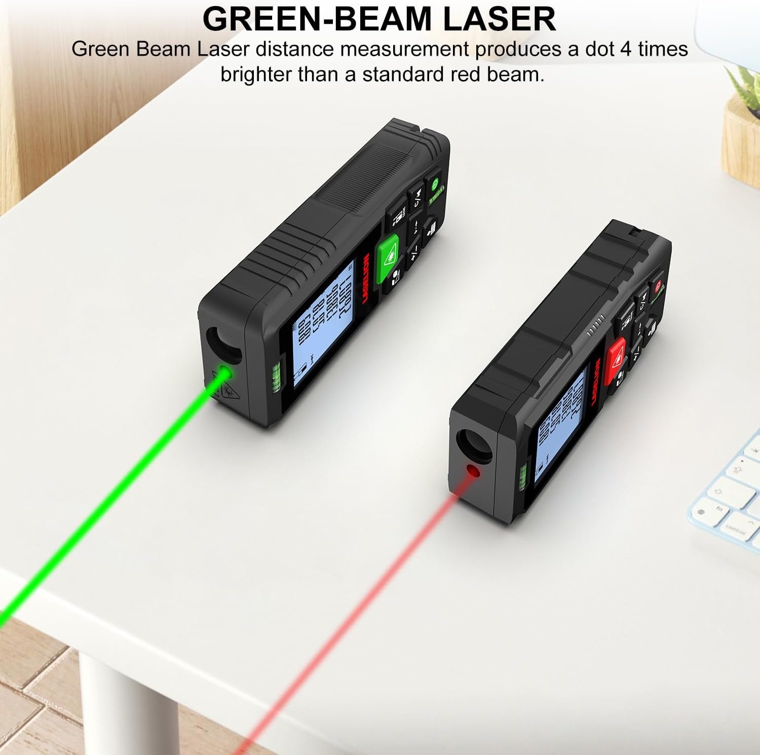 【4 Times Green Beam Laser meter】The Green Beam laser distance meter is brighter than the standard red-beam laser measures,Safety Laser Class II, <1mW power output,which more suitable for outdoor and indoor use.