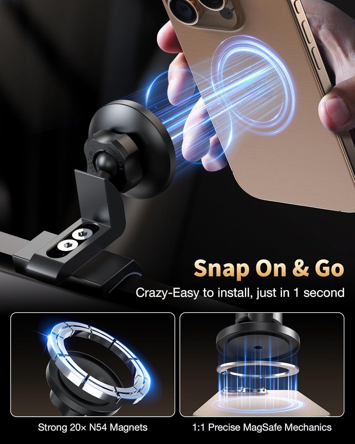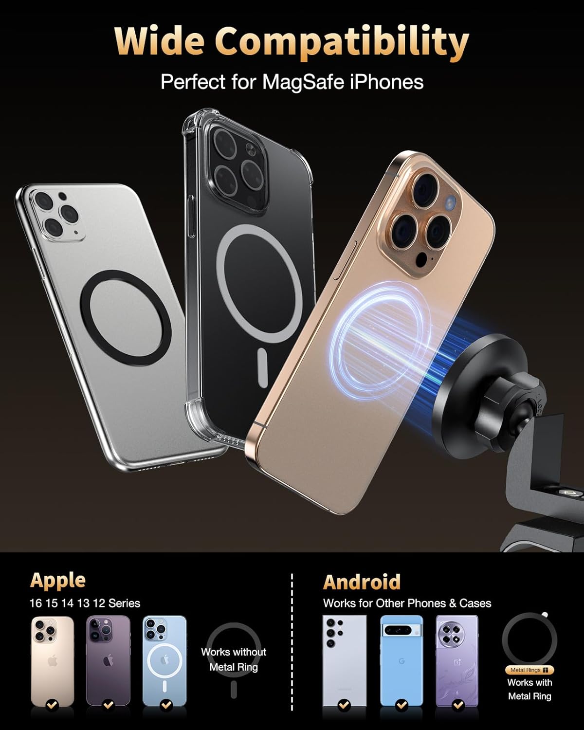 Hands-Free Operation & 360° Adjustable View:No more fumbling while driving. The magnetic suction provides instant one-handed phone attachment with no risk of slipping. Its 360-degree ball joint ensures you can adjust to the perfect viewing angle—whether for navigation, calls, or music—making your drive safer and more enjoyable.