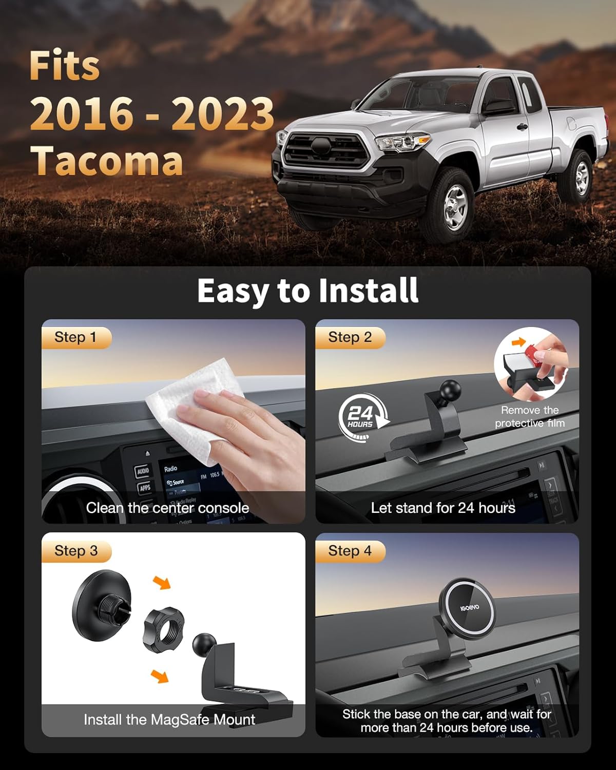 Complete Kit & Friendly Support:Your purchase includes 2 extra VHB adhesive strips, 1 cleaning cloth, and 1 magnetic ring. Please verify compatibility with your vehicle before installation. If you have any questions, our support team is here to help ensure a smooth and satisfying experience with your new Tacoma phone mount.