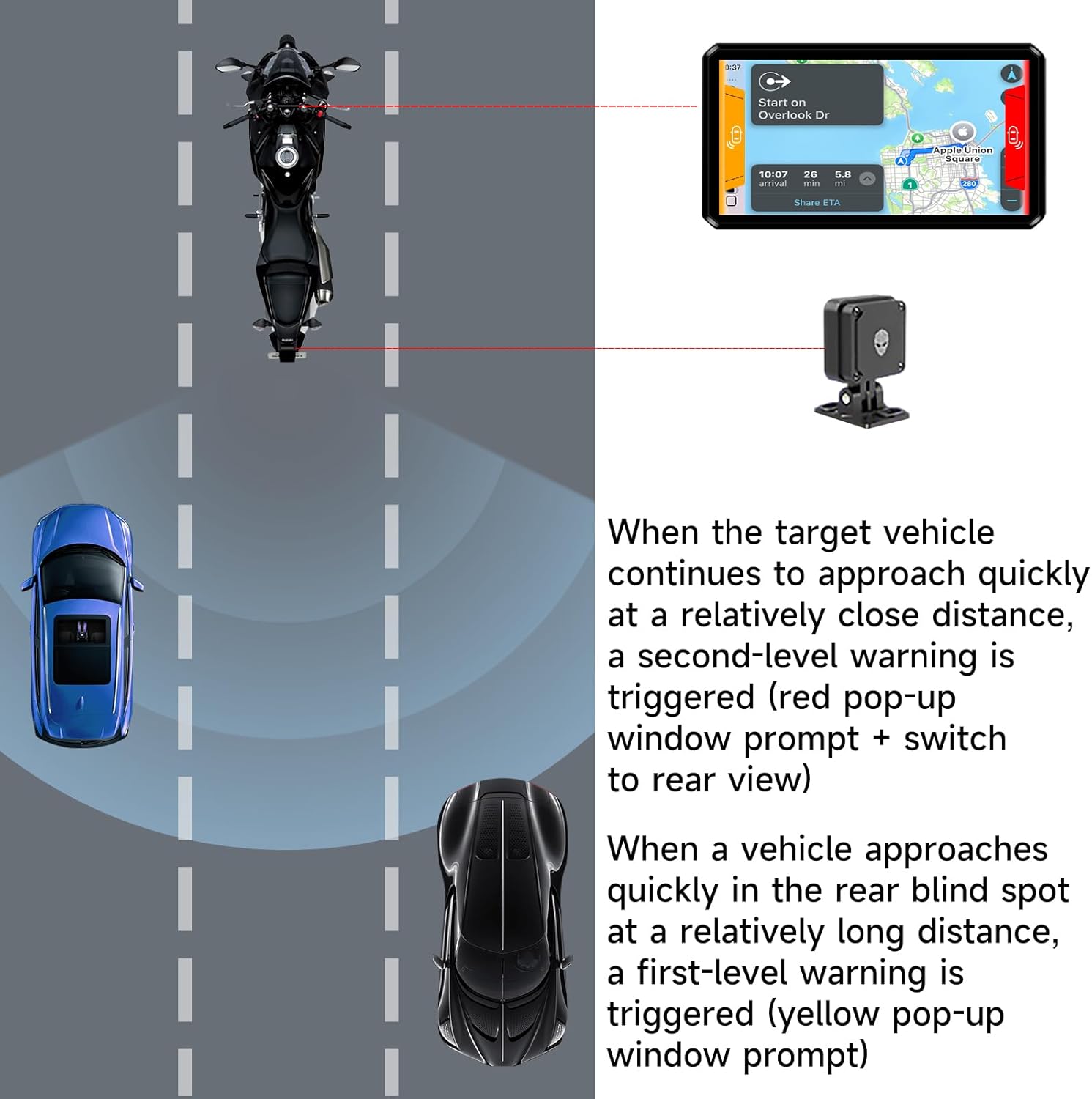 Comprehensive Blind Spot Warning and Safety Assurance – Equipped with 77G millimeter-wave radar, supporting BSD, LCA, and RCW blind spot warning systems, it monitors rear and side blind spot targets in real time, providing early warning of approaching vehicles to ensure driving safety. It can accurately detect and issue primary and secondary warnings regardless of day, fog, or rainy conditions.