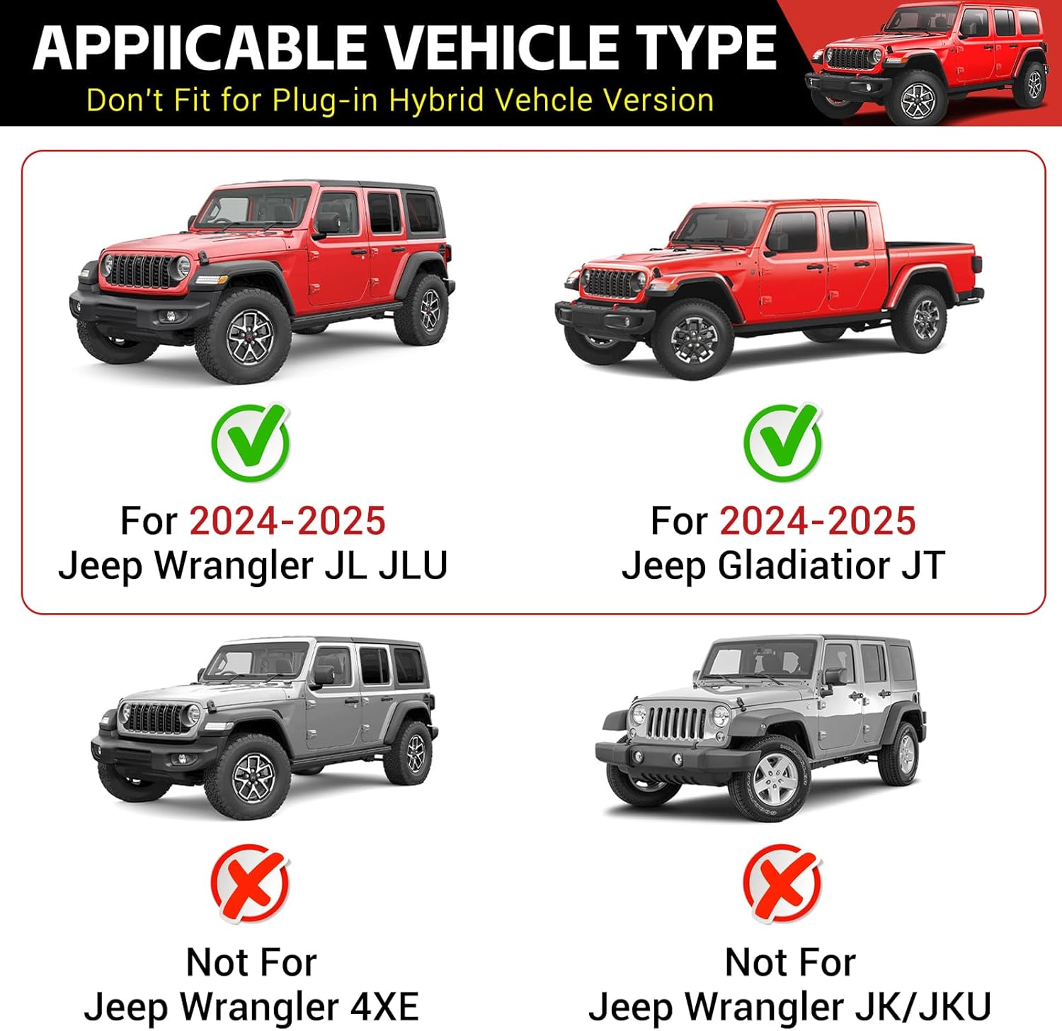 Fit for 2024+ Jeep Wrangler JL JLU&Gladiator JT (Not for JK/4XE or 2018-2023 model). Please check the model of your car carefully before purchasing.