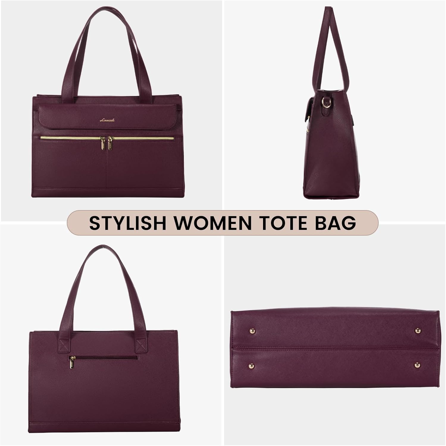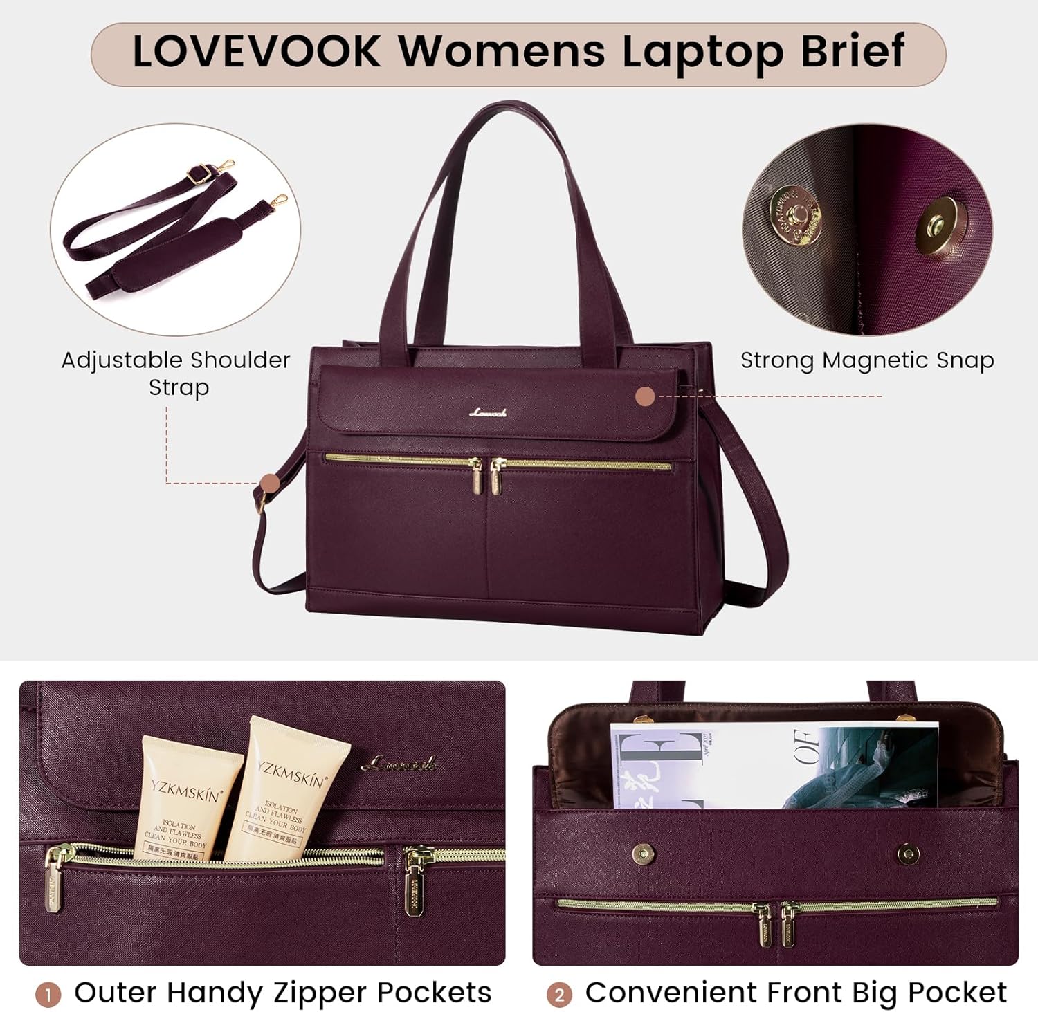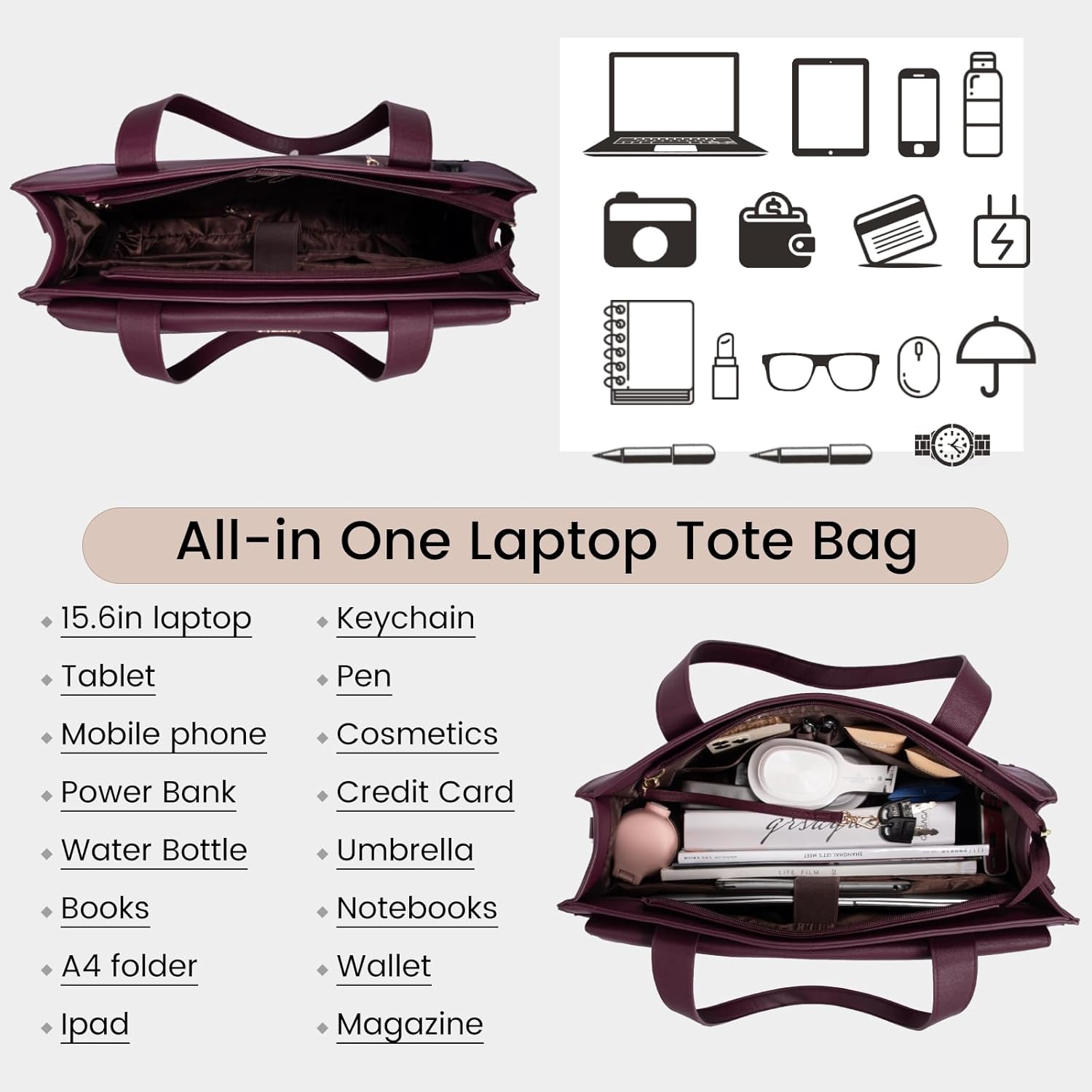 【Ideal Organizer Work Tote】:The work bags for women come with multi-compartments to meet all your work needs well. The laptop tote bag has an independent laptop compartment fits under 15.6 inch laptop and Ipad/tablet,a large main middle pocket designed for documents, book and gadgets,two small square pockets, two pen pockets,There has two side-pocket for power bank and water bottle inside.Stylish outer pocket with magnetic buckle,two zipper pockets and an anti-theft pocket,Easy access to items.