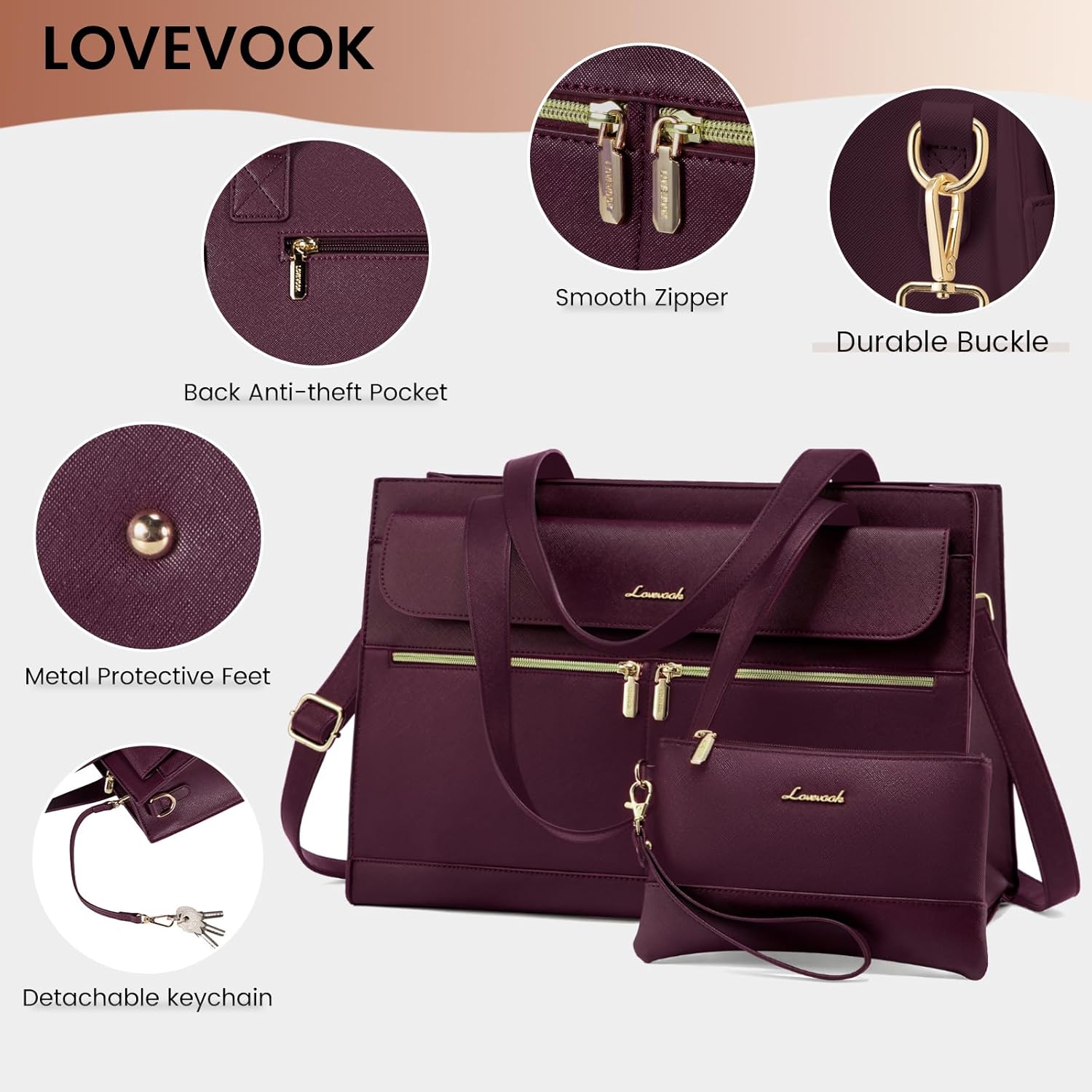 【Perfect Size Womens Briefcase】: Size of the laptop bag is 16.9"Lx6"Wx12"H, finished with a secure zip-top closure. With a removable shoulder strap varied from 28.3 inches to maximum 49 inches and adjustable handles, You be carried in several ways as a ladies briefcase,teacher tote bag, computer bag for women or women crossbody work bag as well, convenient and comfortable.
