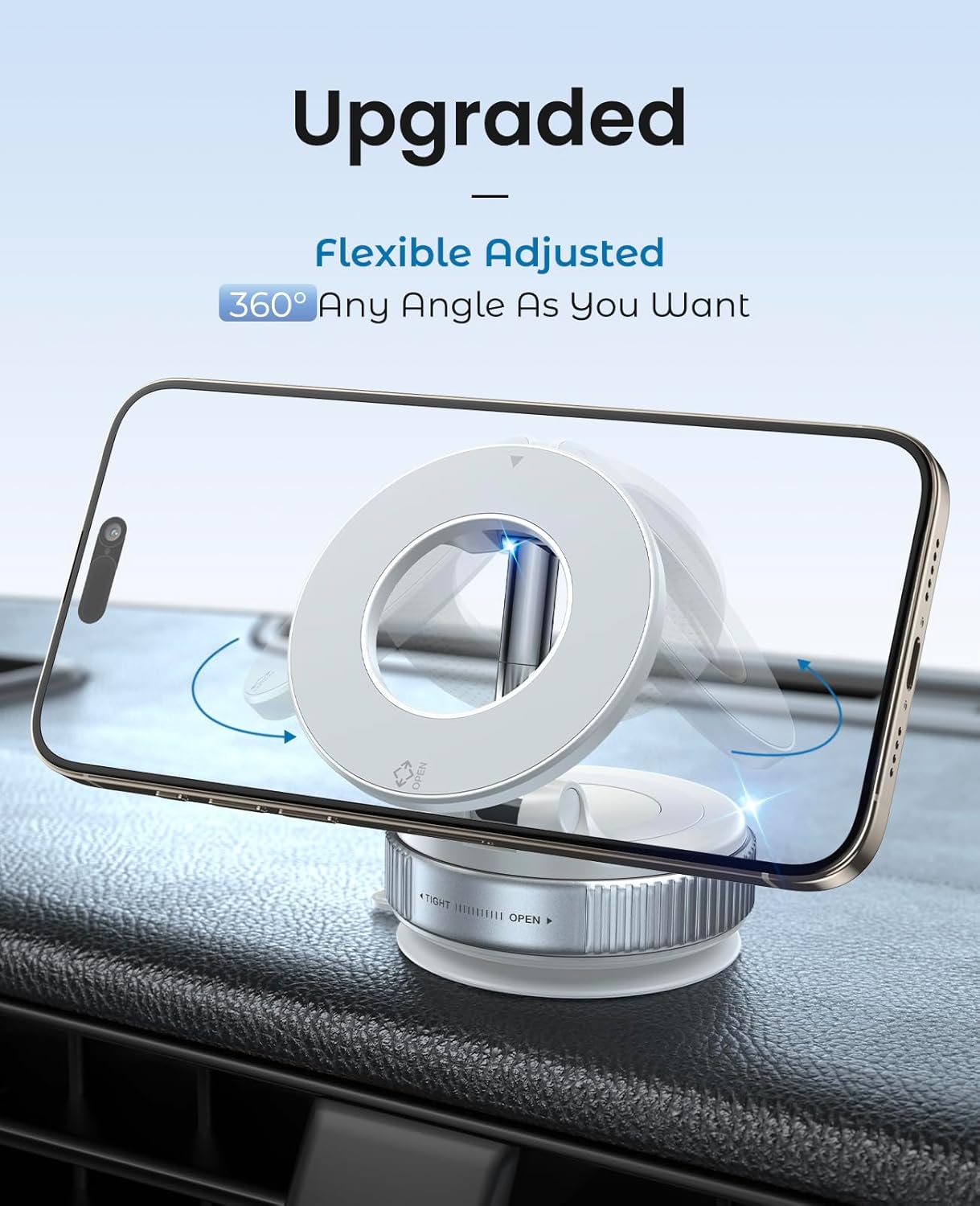 Portable & Amazing Adjustable Cell Phone Holder - Jononser K007 vacuum magnetic phone holder features an innovative transformable dual-axis metal bar, which achieves 210° adjustability in portrait and 360° adjustability in landscape with the smallest size of the whole cell phone stand (2.5“*2.5”*1.5”, 0.2lbs)