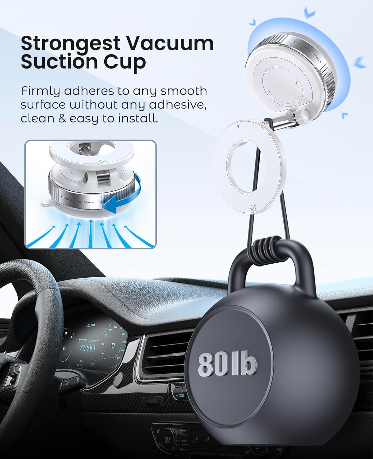 Strong Suction & Stable Hold: This car phone mount uses advanced rotating-lock vacuum suction, boosting suction by 50% compared to traditional press-on mounts. It stays stable on bumpy roads or during sudden stops. The powerful vacuum cup supports up to 80lbs and holds firm in extreme temperatures (-40°F to 300°F). After 9999+ durability tests and 200+ reattachments, it can be cleaned and regain 99% of its suction power for lasting stability.