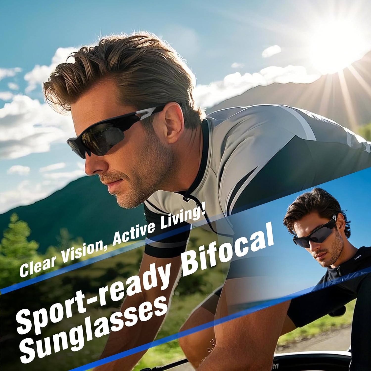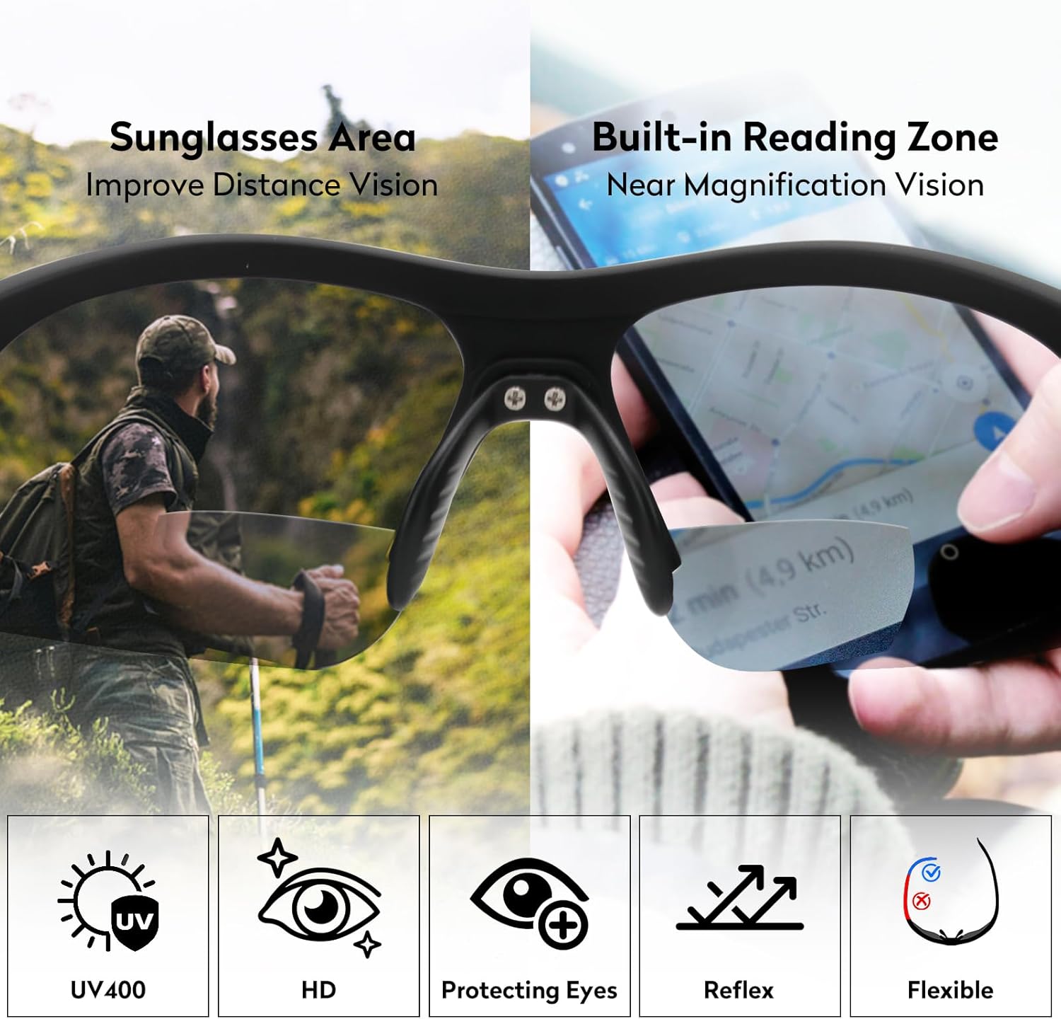 Trendy Meet Practical: Sleek sporty sunglasses feature semi-rimless geometric lenses & dual-focus deliver seamless near/far vision transitions and effectively block UV damage. Lightweight sunglasses for hiking, cycling, or daily wear—blends fashion-forward style with all-day comfort to keep you confidently standout