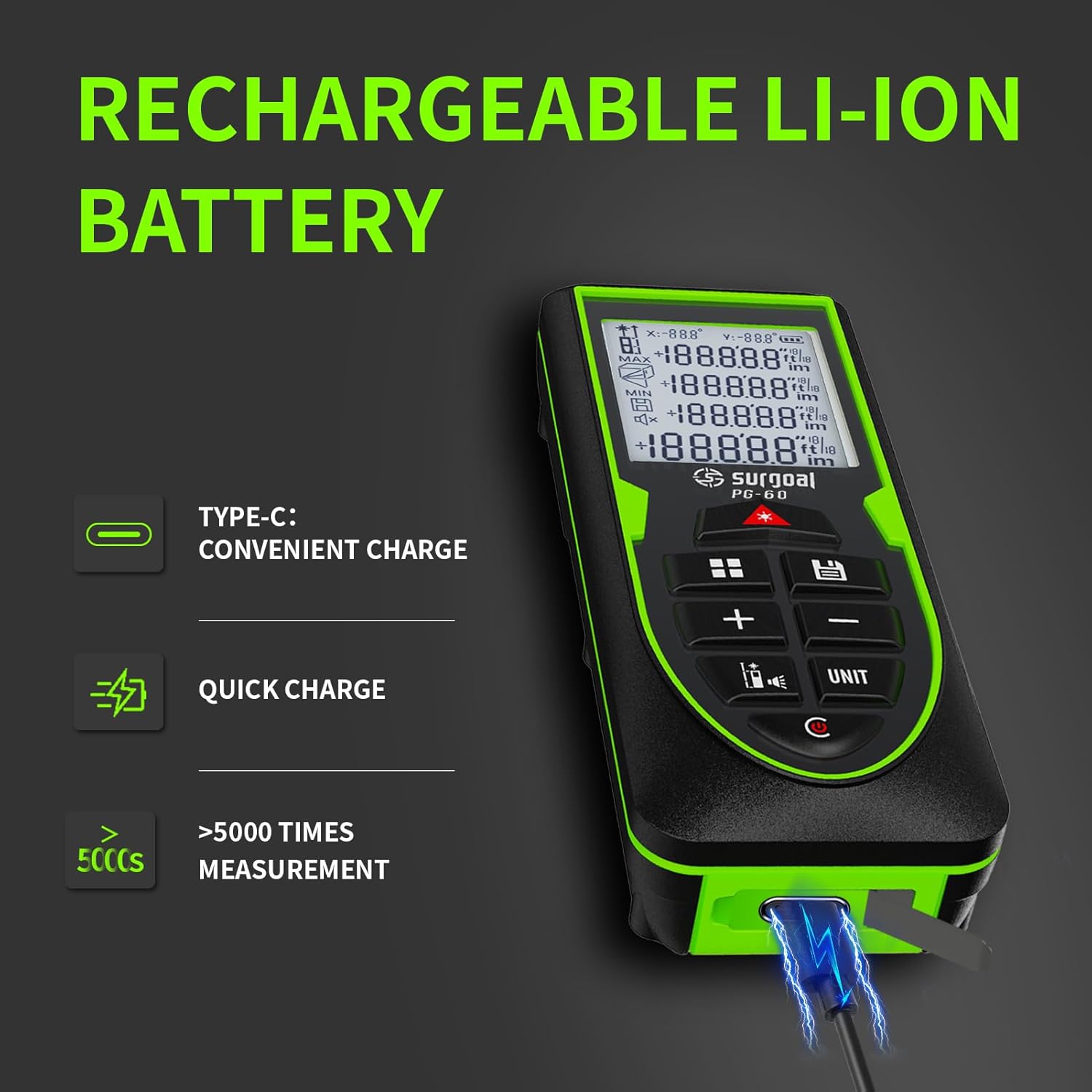 【TIPS】When you first use SG SURGOAL laser distance meter, please charge it in advance. To avoid the screen doesn't bright when you use it.