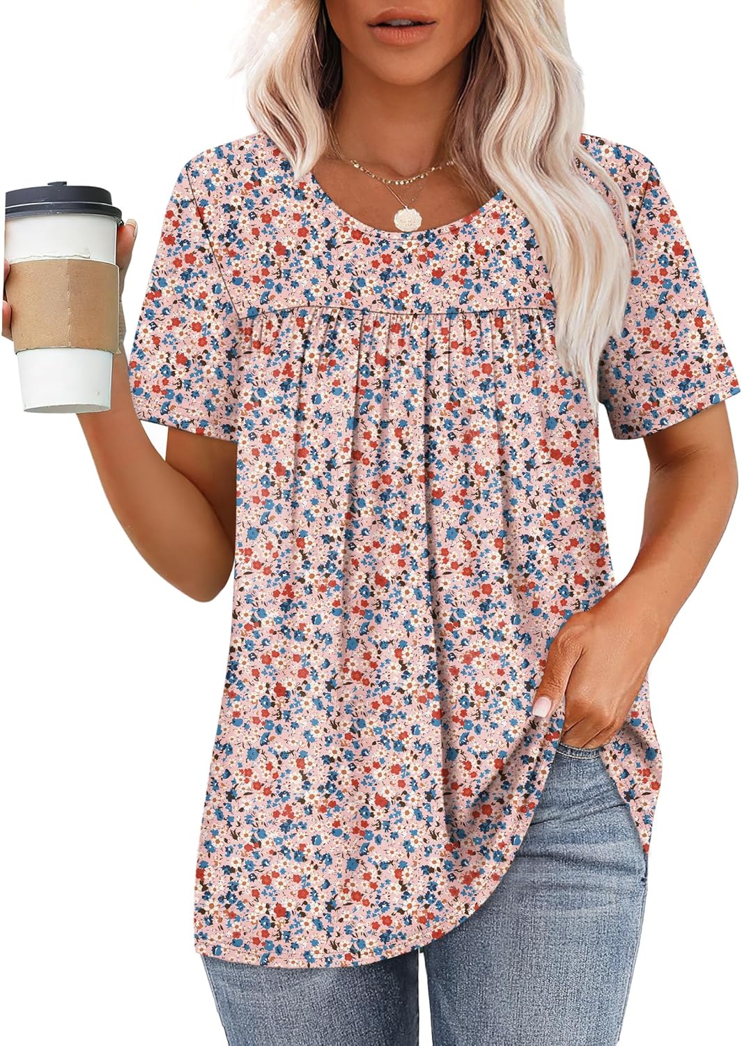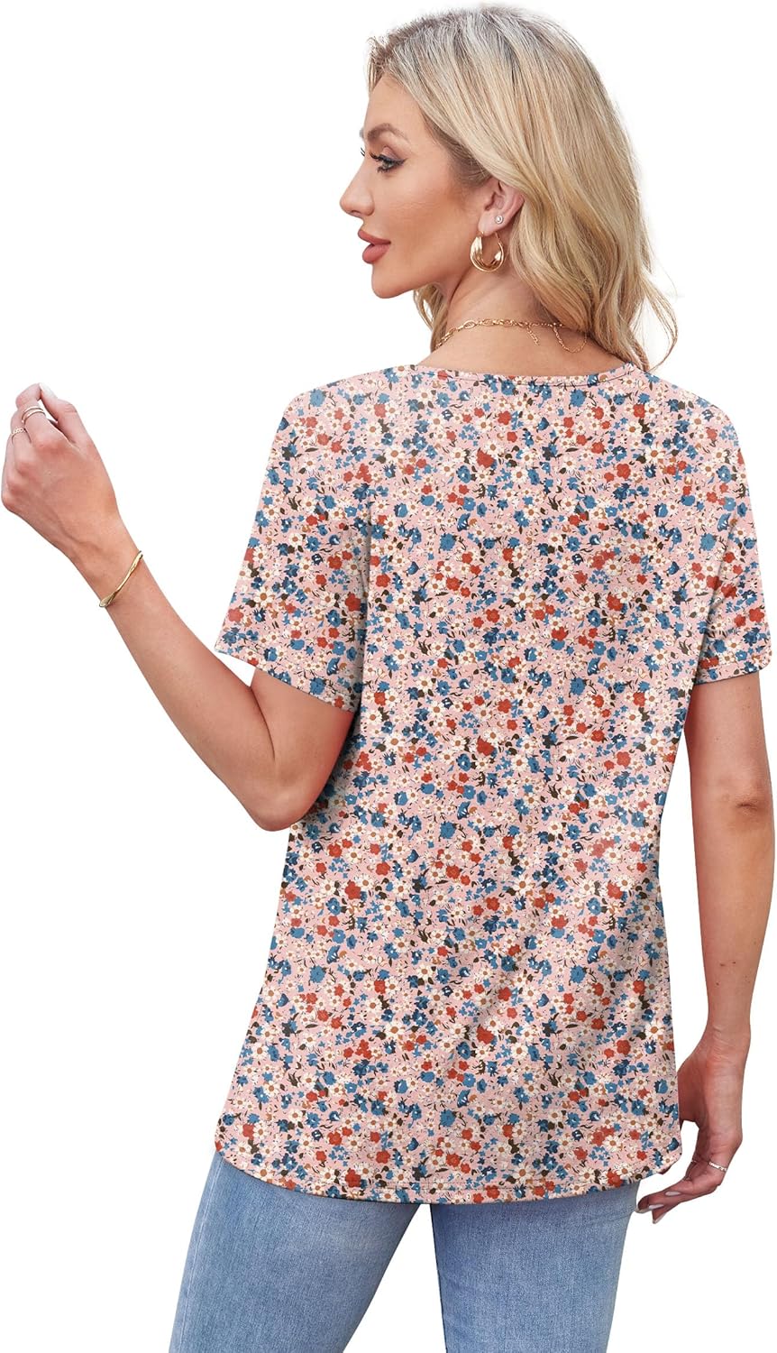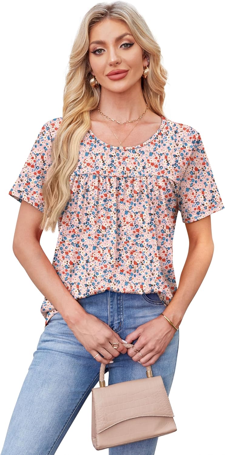 WIHOLL Womens Tops Short Sleeve T Shirts Pleated Dressy Casual Round Neck Summer Clothes Outfits Blouses Loose Fit
