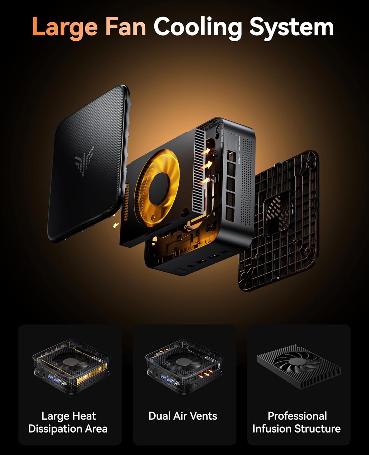 【Efficient Cooling】KAMRUI E3B small gaming pc equipped with dual built-in fans and a radiator, this system ensures efficient and whisper-quiet cooling, effectively reducing CPU temperatures and minimizing hardware wear. It achieves faster response times, maintaining optimal performance by preventing overheating, lag, and system freezes, thereby guaranteeing a stable and seamless user experience.