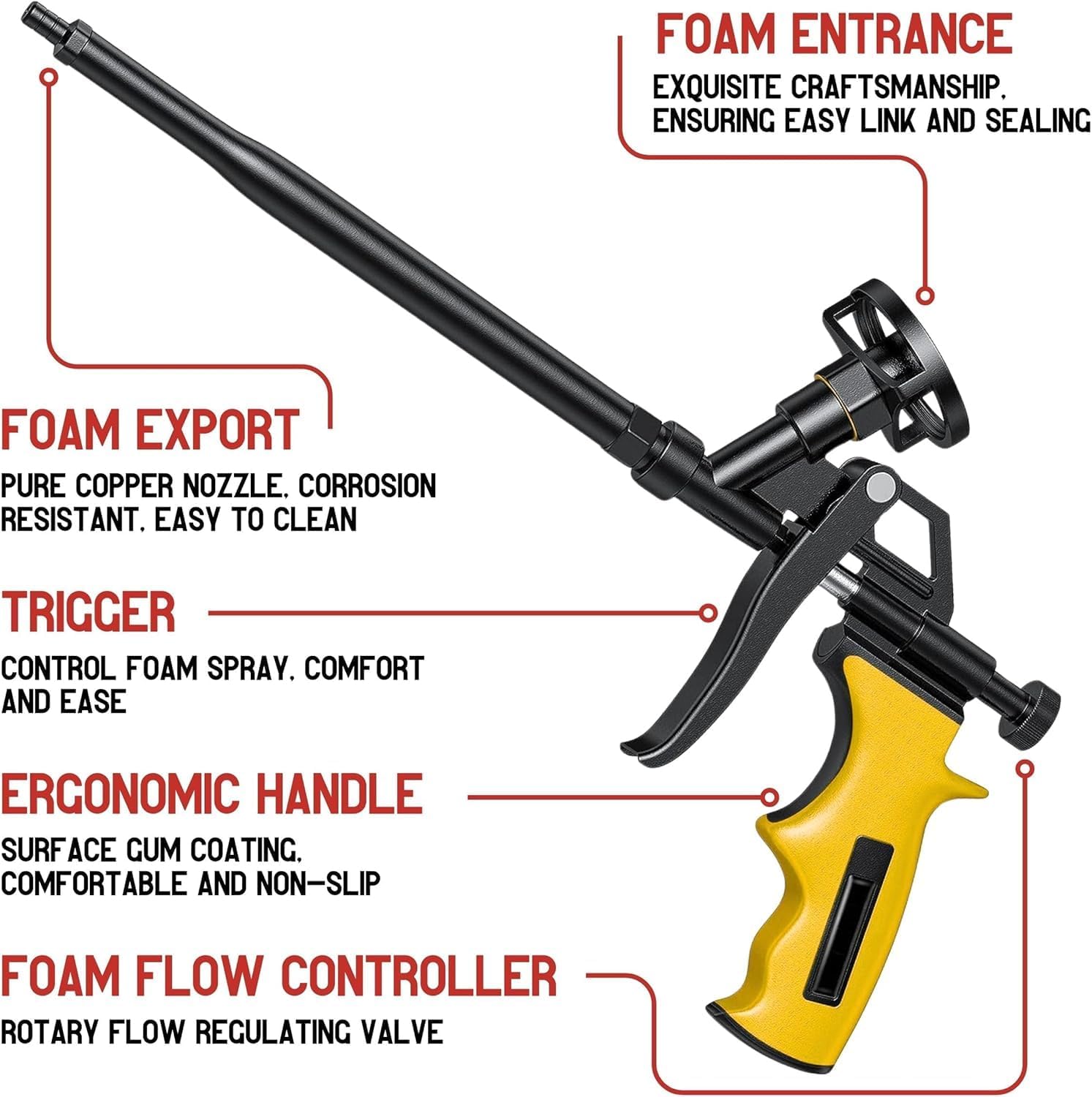 USER-FRIENDLY DESIGN: Foam spray insulation gun is equipped with a trigger mechanism. Precise control - easy to adjust foam flow as needed. This gun foam is designed for seamless and effective results, fulfilling a range of application requirements