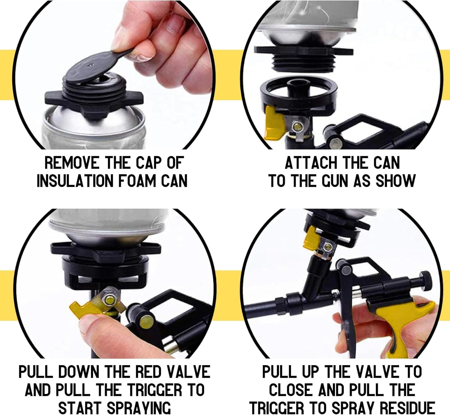 EFFICIENT FOAM DISPENSING GUN: The set includes 4 x yellow foam gun. Designed for maximum efficiency, adhesive foam gun helps reduce waste while ensuring an even coating for all your projects. Consistent & high-quality foam application