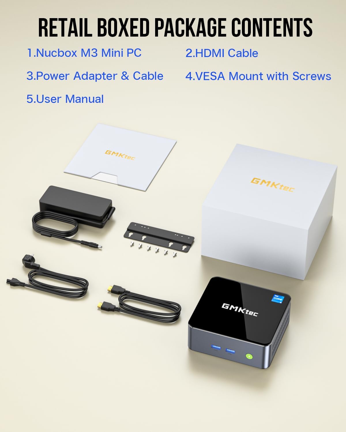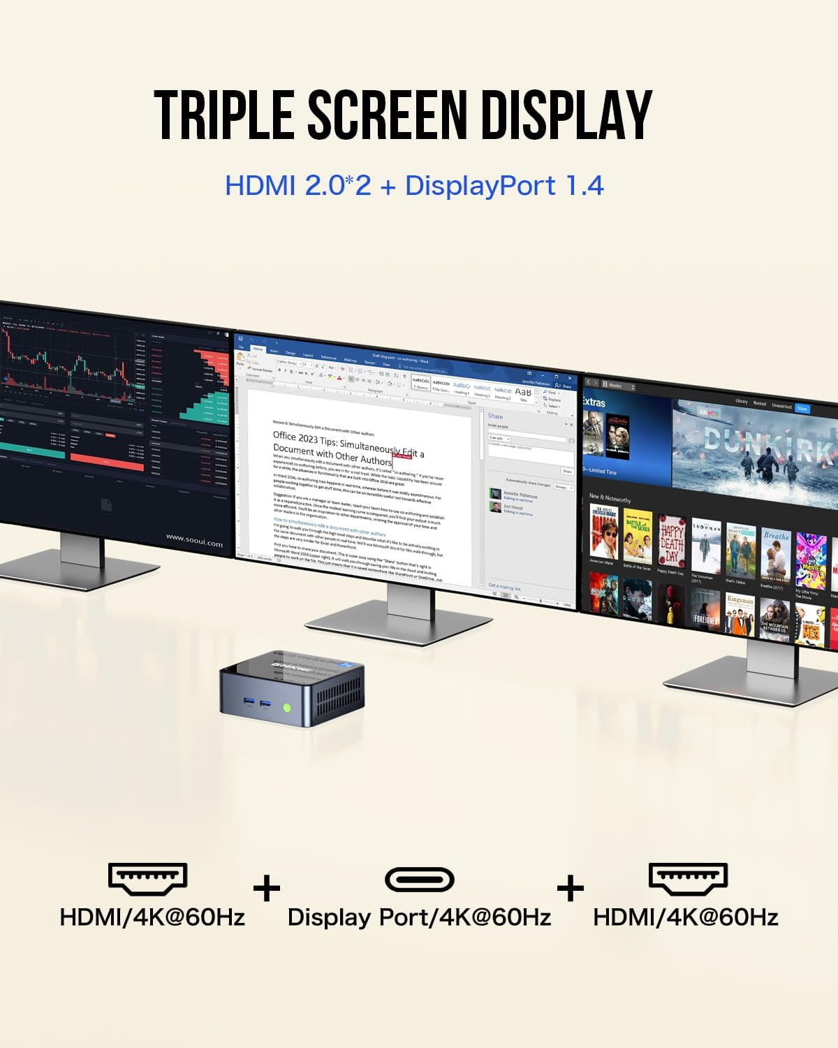【Rich Interface & Small Form Factor】The mini desktop computers comes with 2 x HDMI 2.0 (4K@60Hz), 3 x USB 3.2, 1 x USB 2.0, 1 x DC Port, 1 x Type-C (Power/Data), 1 x LAN Port, 1 x Audio-in/out Jack ports. The size of the small computer is only 4.48x4.17x1.67 inches, easy to carry and organize on your desktop. Our complimentary VESA bracket can mount the micro pc on the wall or on the monitor.