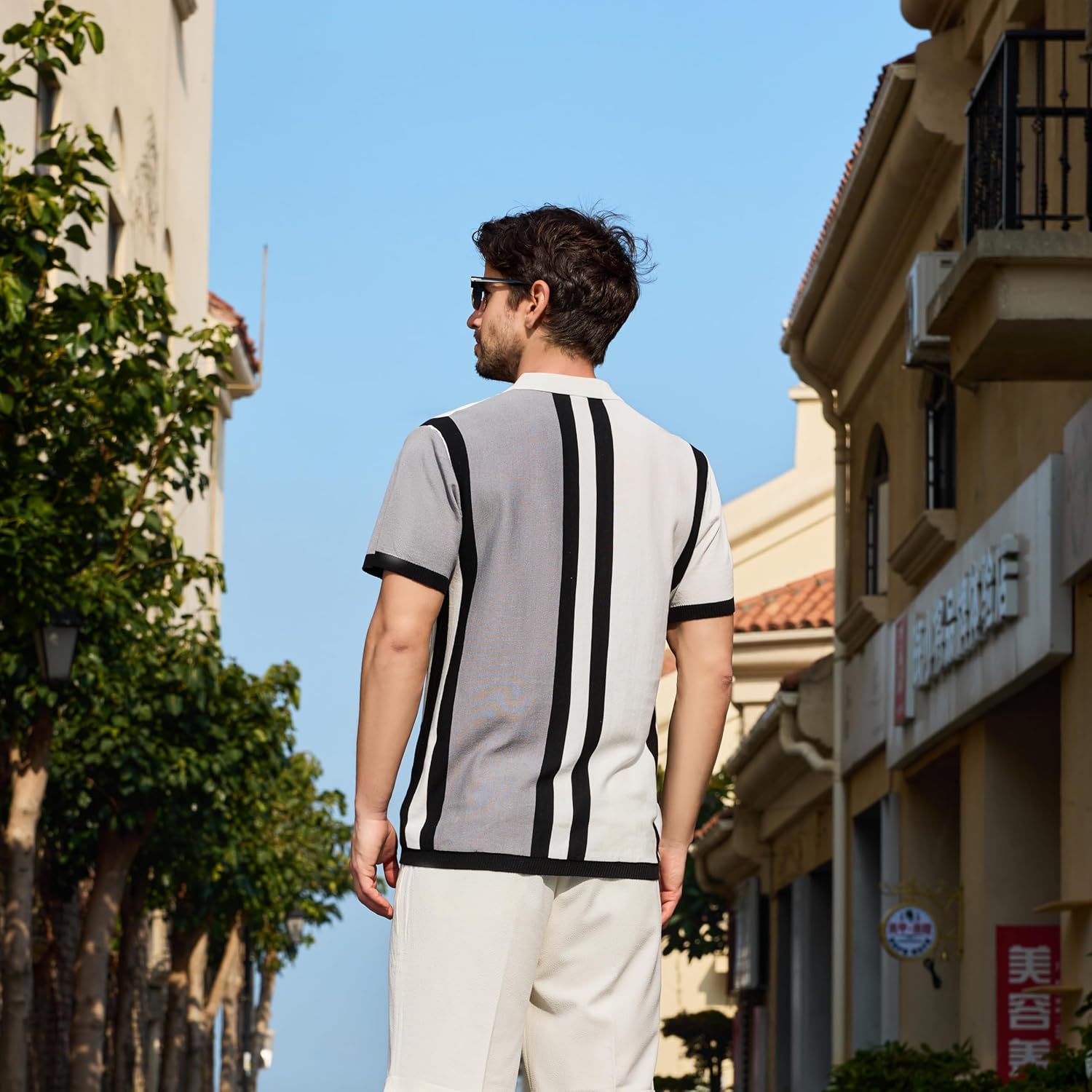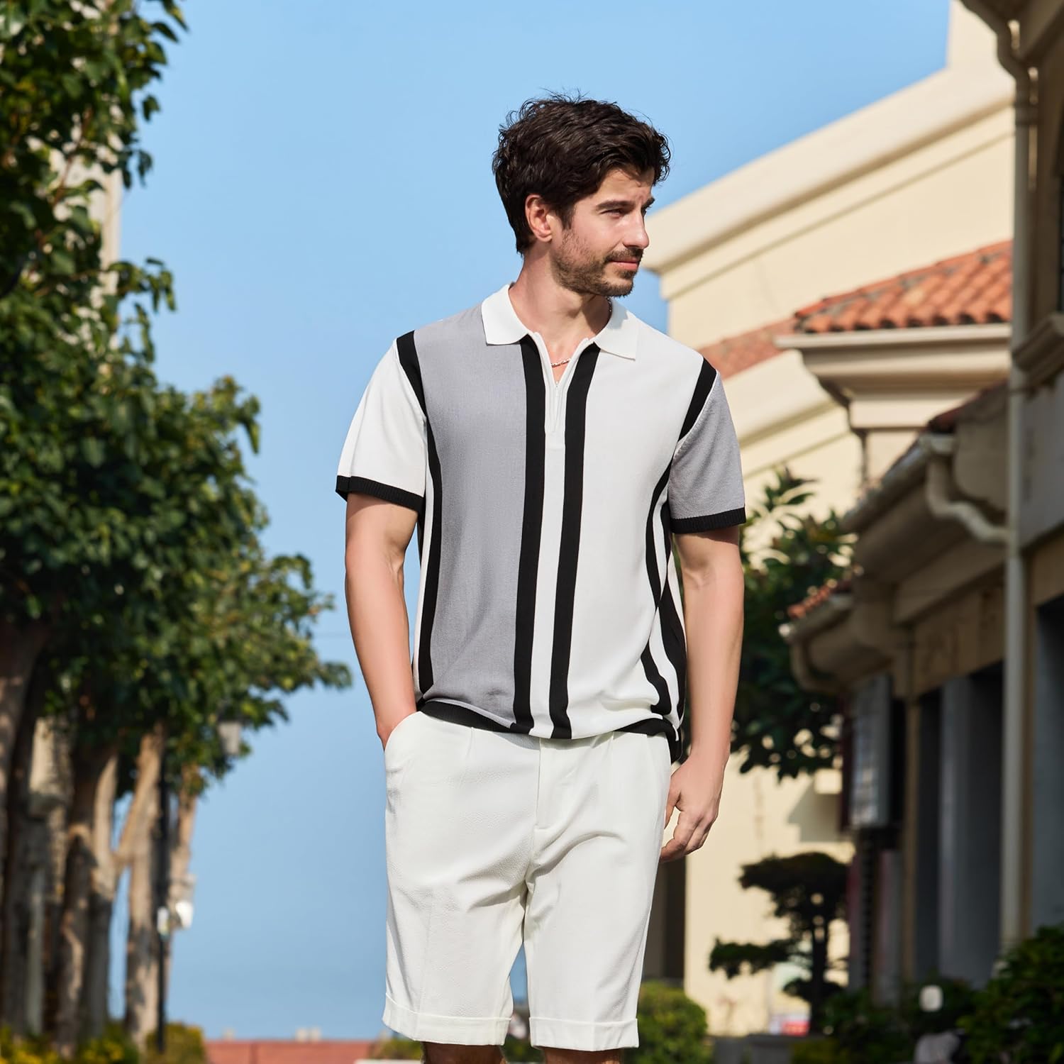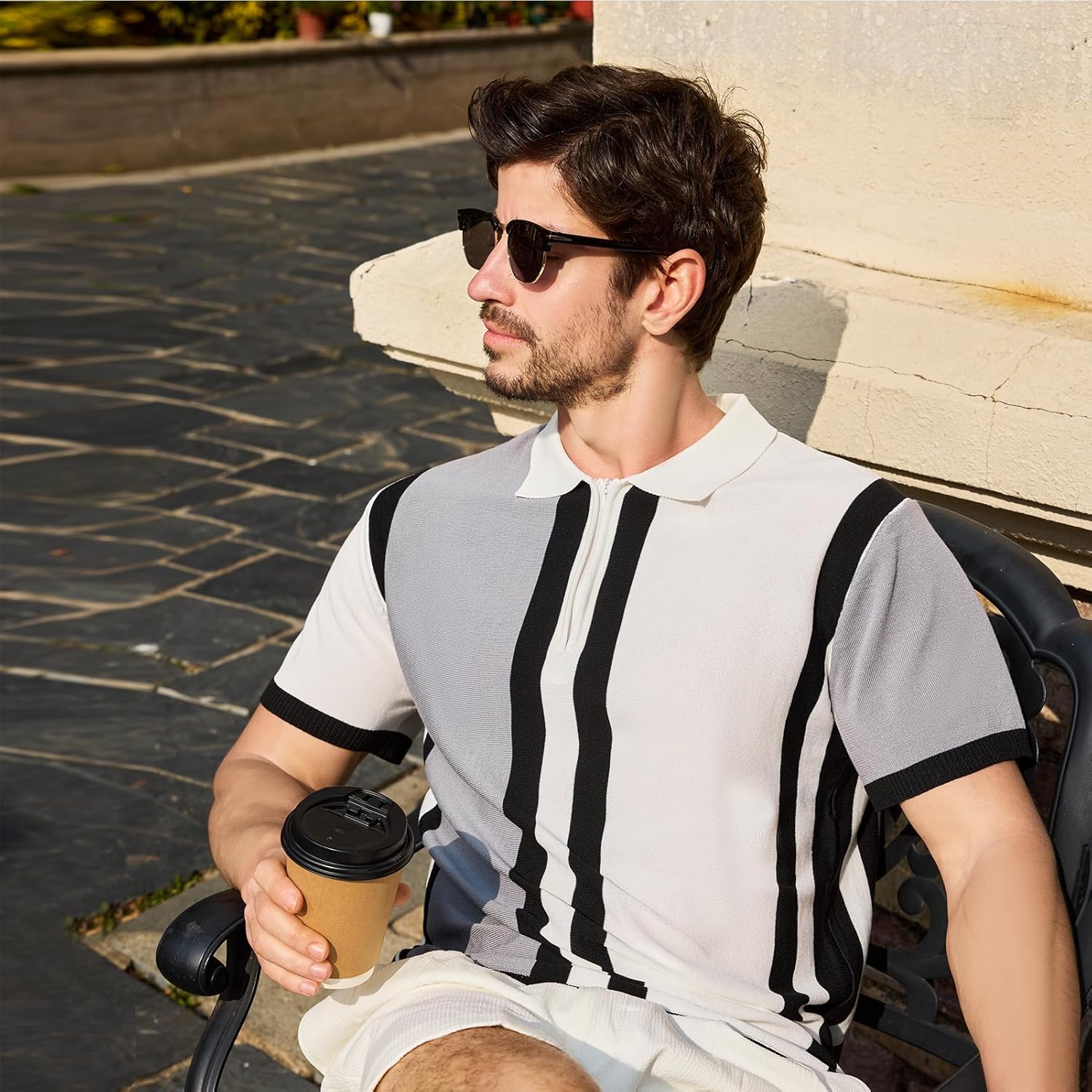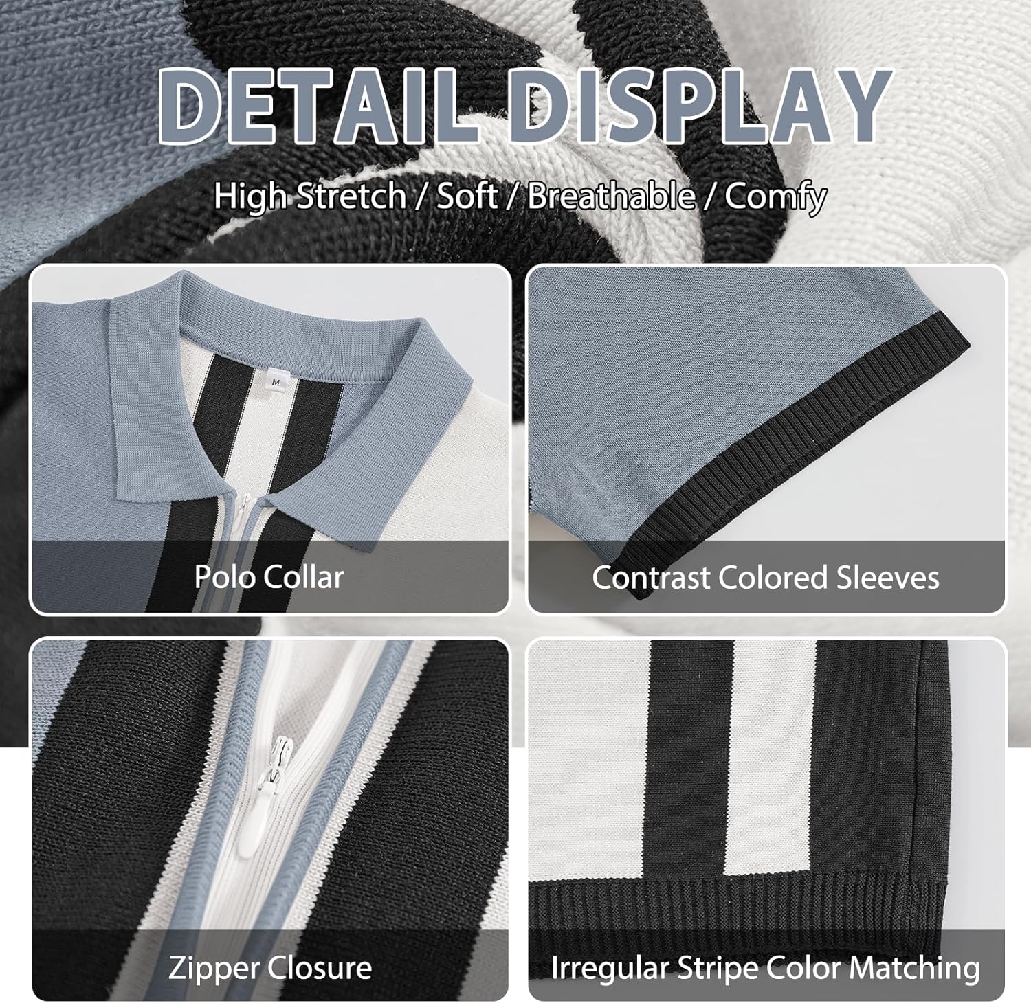 Men's Fashion Knit Polo Shirts Vintage Striped Knitting Shirts Ribbed Slim Fit Golf Shirts
