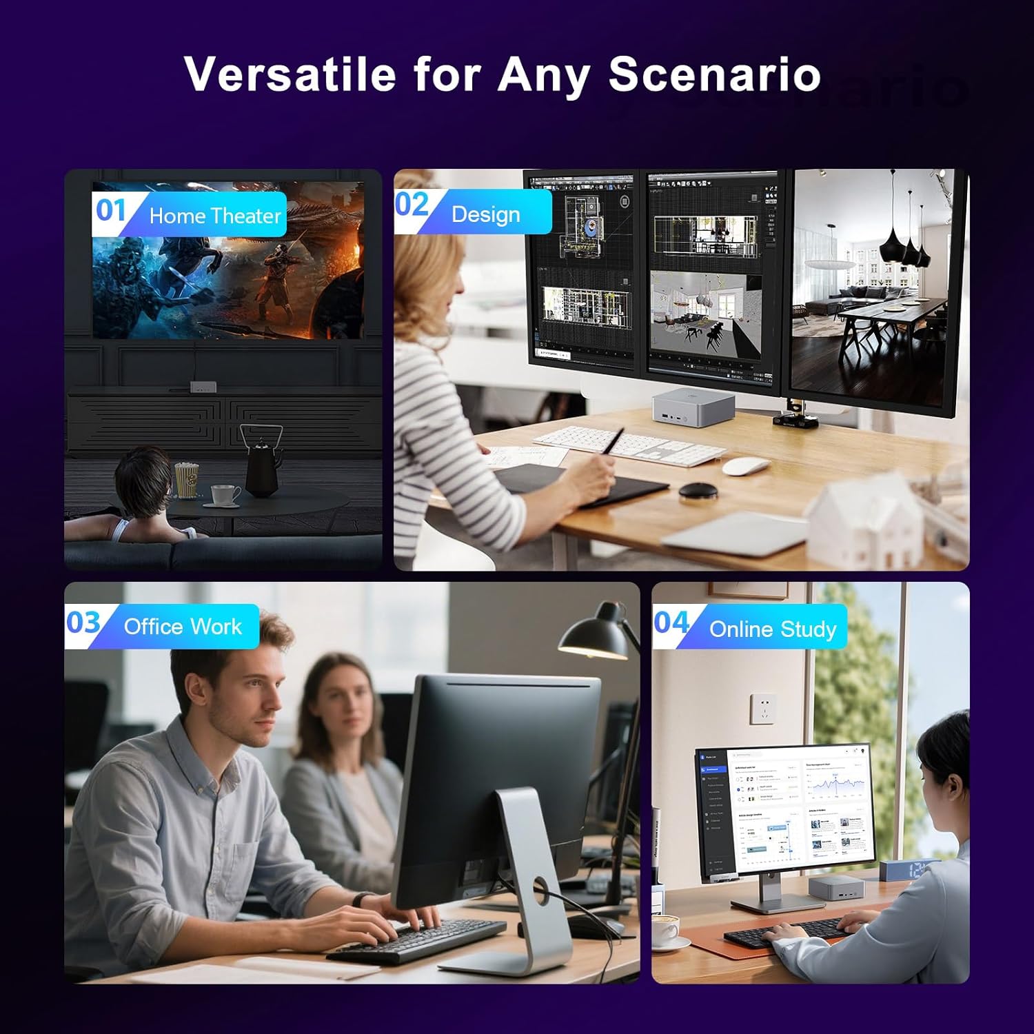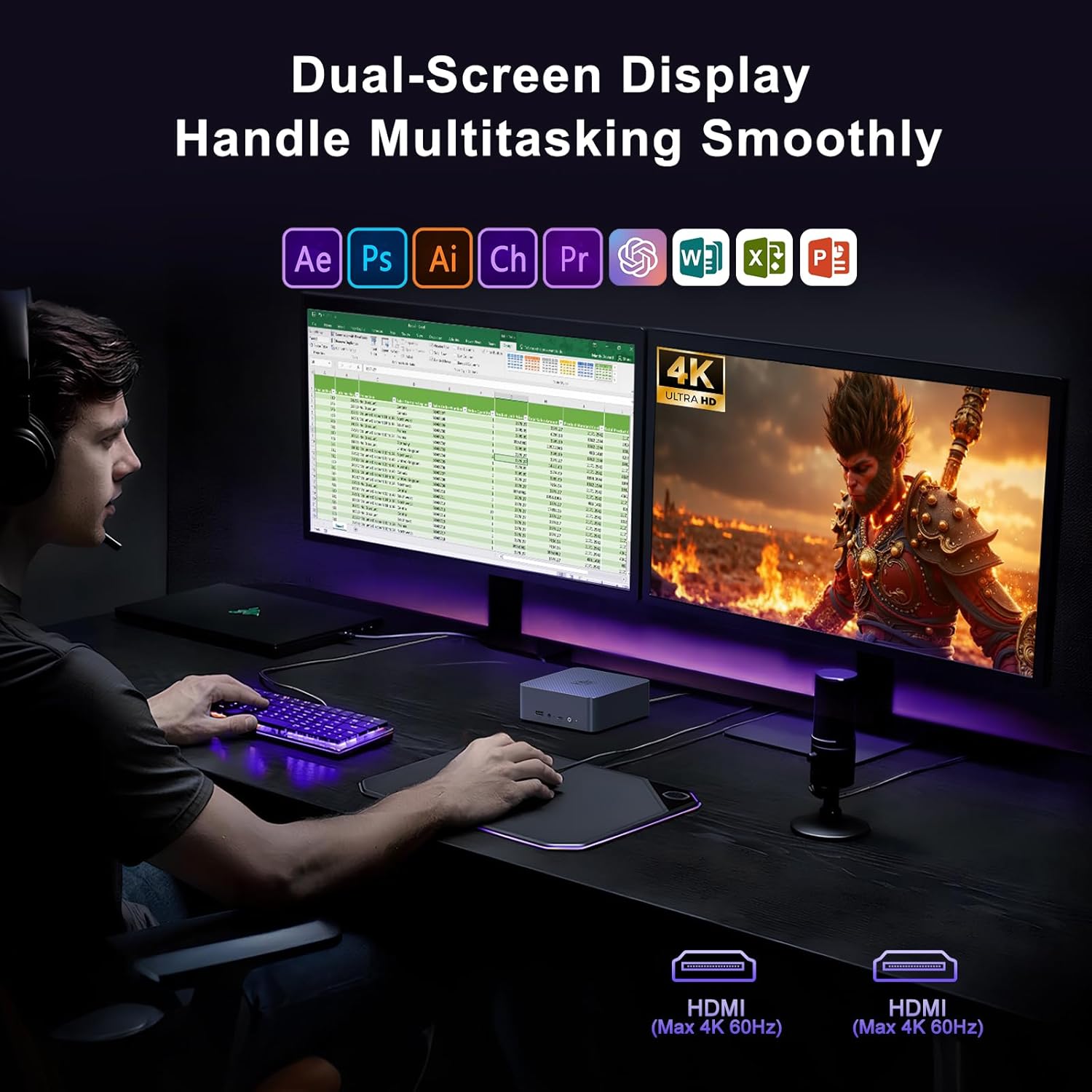 16GB DDR4 3200MHz & 500GB M.2 PCIe4.0x4 SSD: EQi12 mini pc comes with 16GB DDR4 RAM (8GB * 2, dual-channel, expandable up to 64GB) and 500GB M.2 2280 PCIe4.0x4 SSD. NVMe M.2 SSD expandable to 4TB (2TB * 2). Large capacity helps to save more large programs in the computer and brings blazing-fast operation of multi-tasking. High-speed SSD enables quicker load time of large files and high resolution content