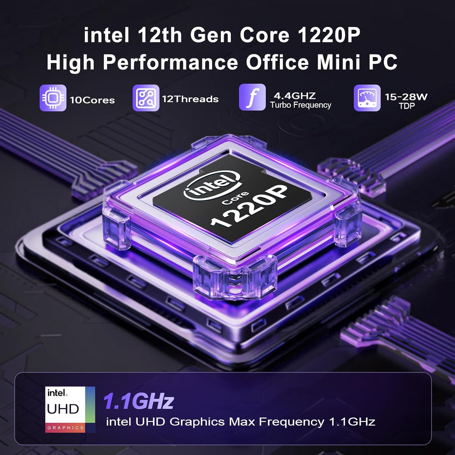 Powerful Intel Core 1220P Processor: This Beelink Mini PC is equipped with Intel Core i3-1220P processor (10 cores 12 threads, 3.3GHz - 4.4GHz, 12M Smart Cache). The performance of 1220P mini pc is improved by 24% compared to Core i5-11320H. This mini computer is integrated with an Intel UHD Graphics 1.1GHz, ideal for editing high-resolution videos and images and multimedia playback with KODI or IPTV up to 4K