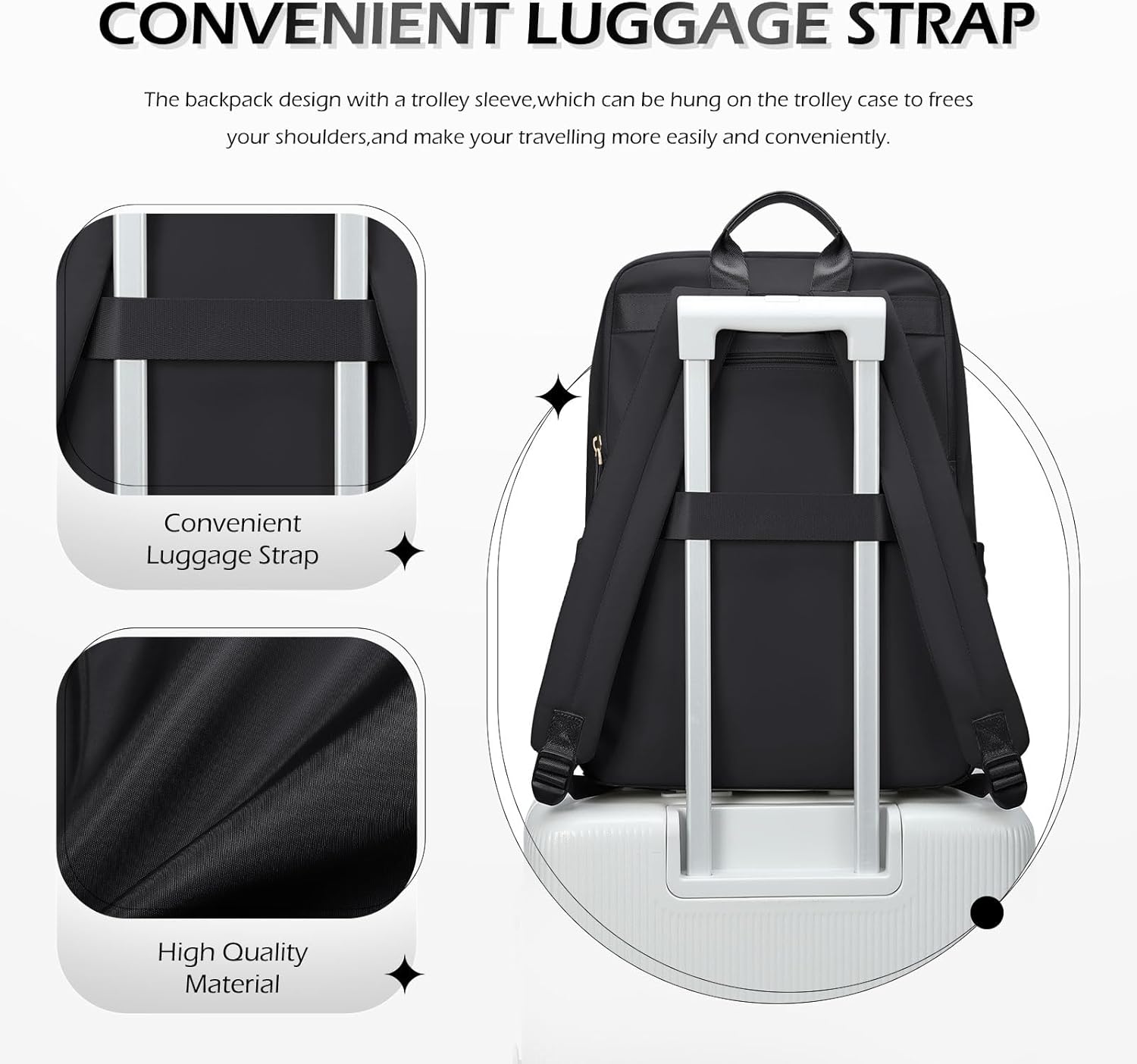 ANTI THEFT BACKPACK: Travel Backpack Women Comfortable, breathable back design offers you maximum back support; A luggage strap allows the large laptop backpack to slide securely over the handle of any rolling luggage for hands-free transportation, easier to carry. Computer backpack a hidden anti-theft pocket on the back protects your valuable items from thieves