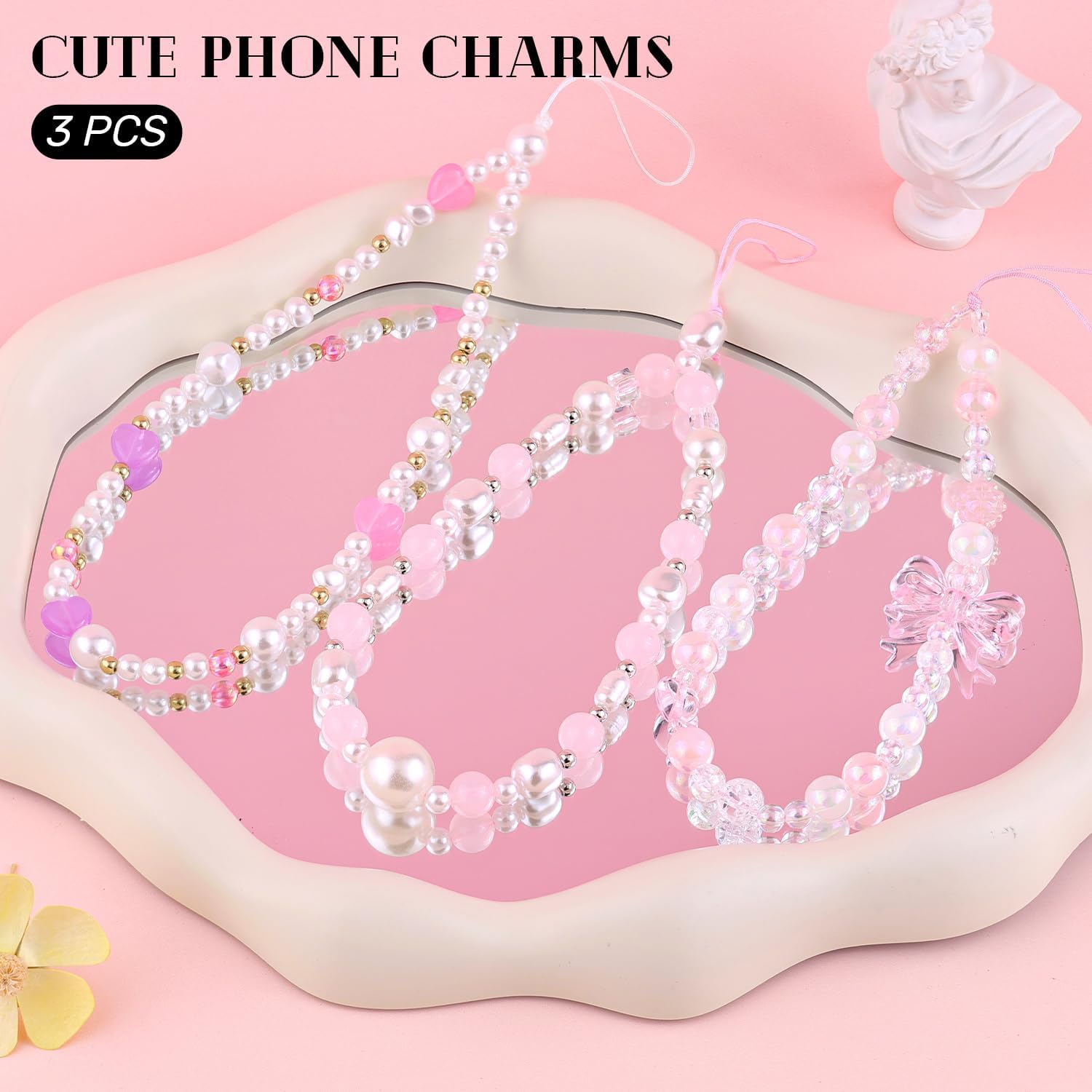 3 PCS Cute Phone Charms Aesthetic Y2K Cellphone Wrist Strap Bedazzling Flower Bow Butterfly Accessories ABS Imitation Pear...