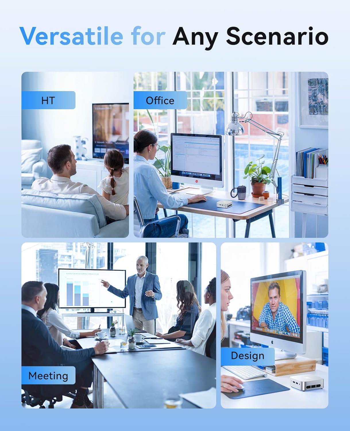 【COMPACT DESIGN WITH VERSATILE PORTS】MINI PC small form factor (3.9 x 3.9 x 1.3 inches) with a VESA mount for flexible placement. Offers a variety of ports for seamless connectivity with multiple devices.