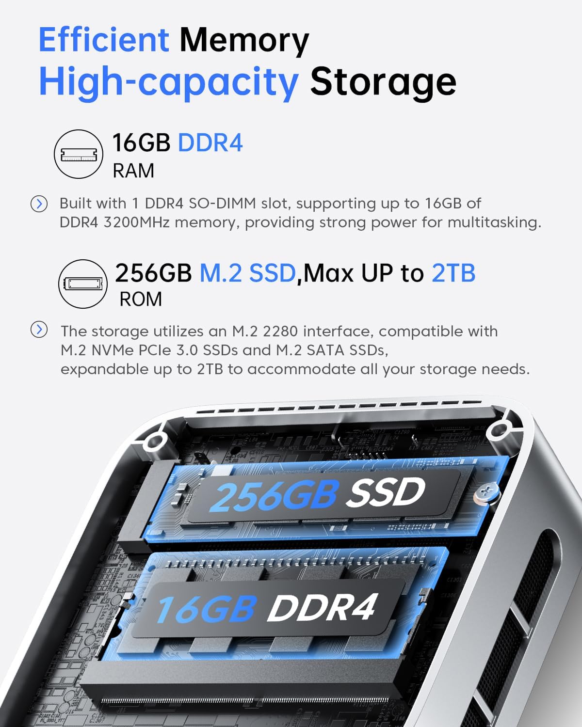 【AMPLE STORAGE AND HIGH-SPEED MEMORY】Mini computers Comes with 16GB DDR4 RAM and 256GB M.2 SSD for seamless multitasking and fast data access. Expandable up to 2TB(Not included) for all your storage needs.