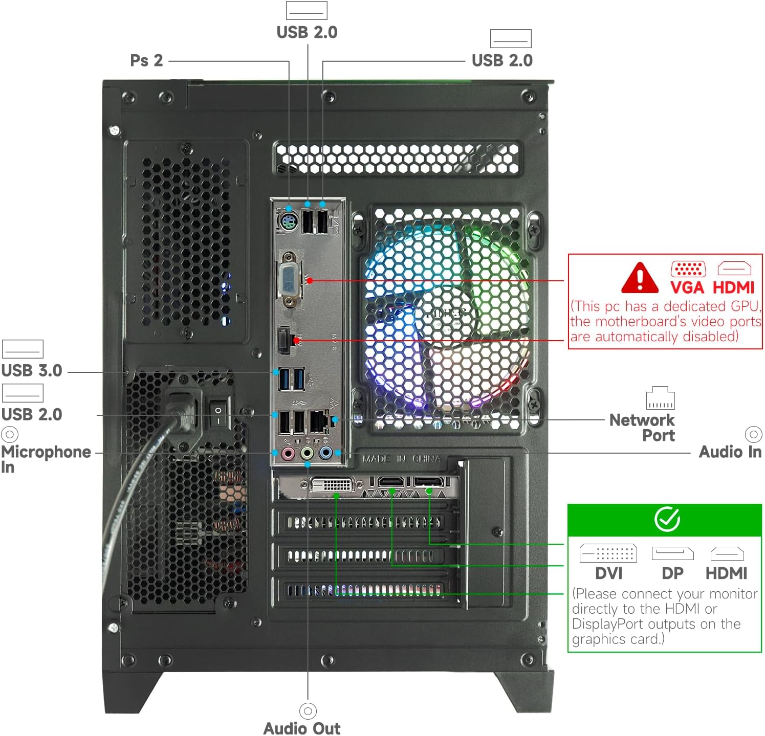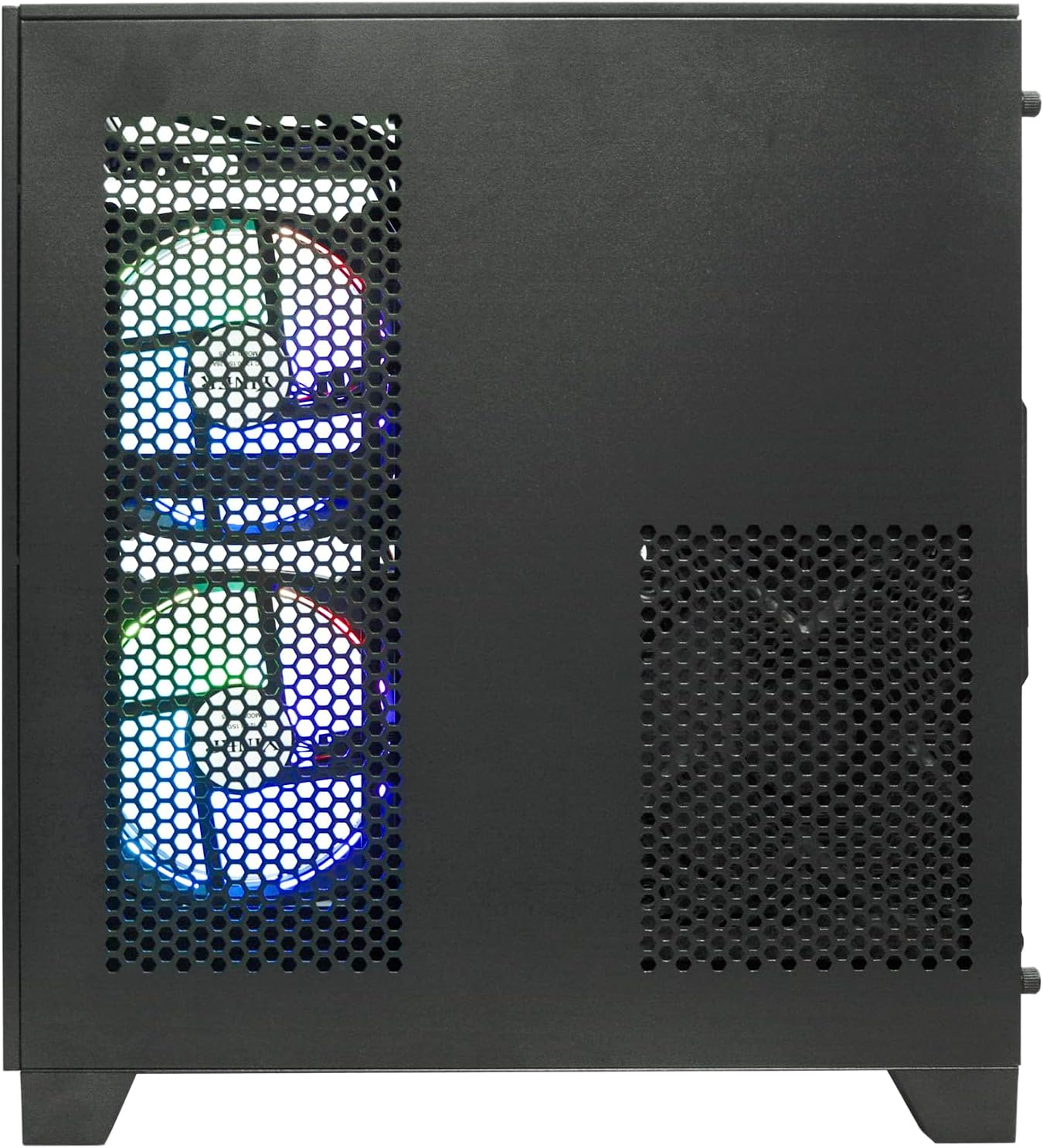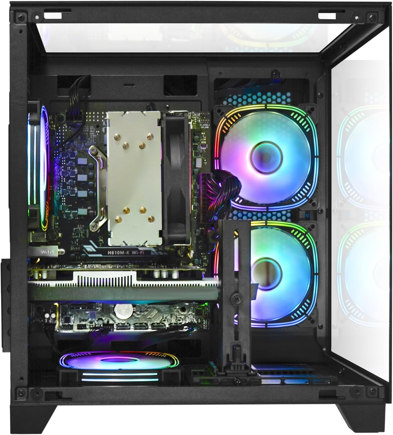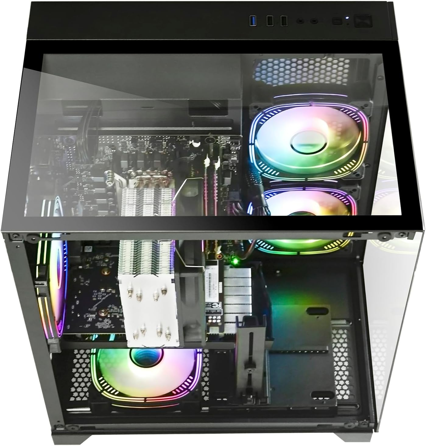 Design & Extras: The PC is equipped with 5× RGB fans and lighting effects. These lights can be set according to the user's preference, adding a splash of colour to the PC and enhancing the overall visual effect. The chassis is designed with glass panel on three sides, which allows users to visualise the internal hardware layout and lighting effects. At the same time, the glass side panels also ensure good heat dissipation performance, ensuring that the hardware remains stable under prolonged operation Applicable Scenarios.