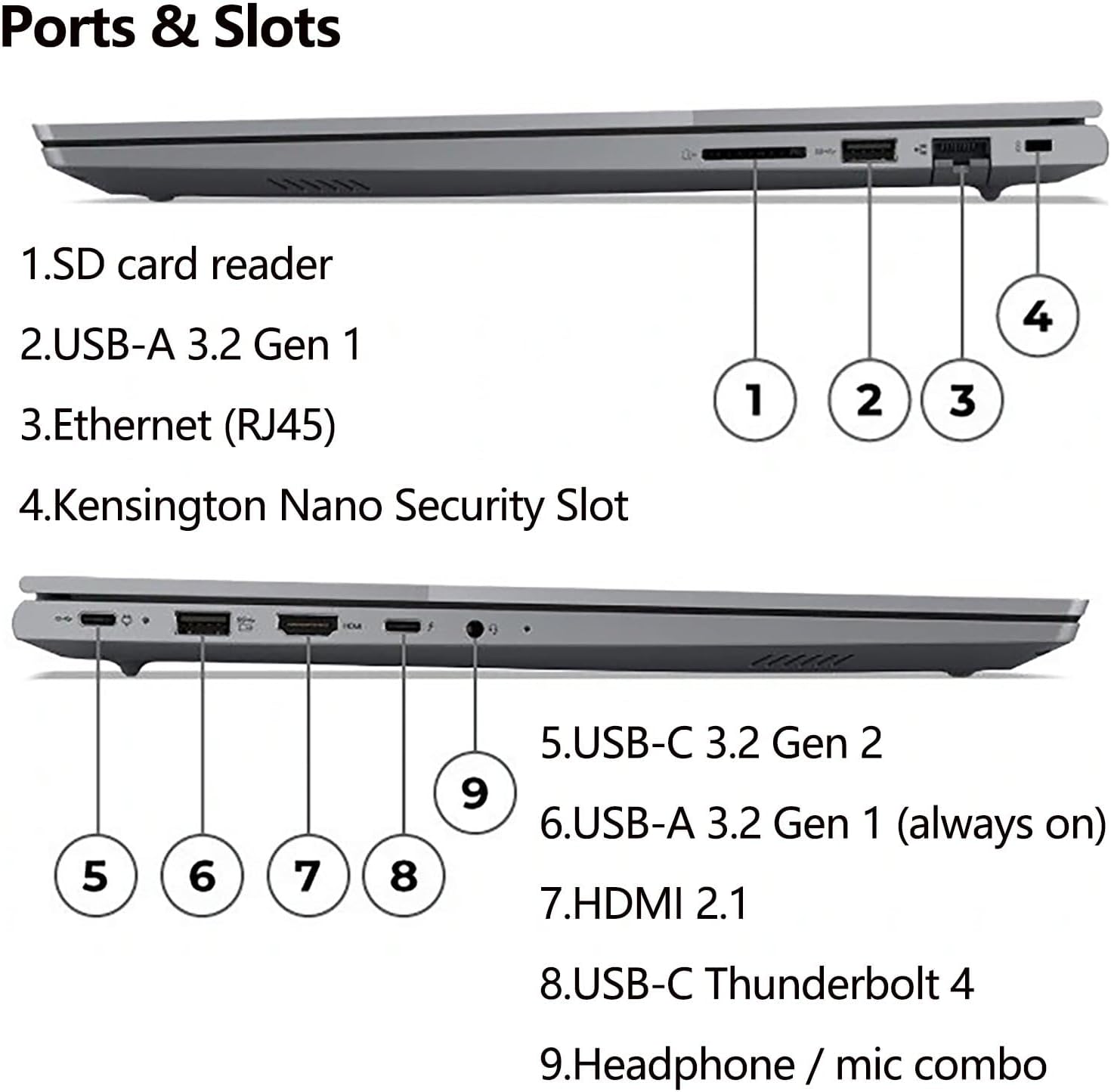 Wireless: Wi-Fi 6E 2x2 and Bluetooth 5.3. 1x USB 3.2 Gen 1, 1x USB 3.2 Gen 1 (Always On), 1x USB-C (USB 10Gbps / USB 3.2 Gen 2), with USB PD 3.1 and DisplayPort 1.4, 1x USB-C (Thunderbolt 4 / USB4 40Gbps), with USB PD 3.1 and DisplayPort 2.1, 1x HDMI 2.1, up to 4K/60Hz, 1x SD card reader, 1x Ethernet (RJ-45), 1x Headphone / microphone combo jack (3.5mm).