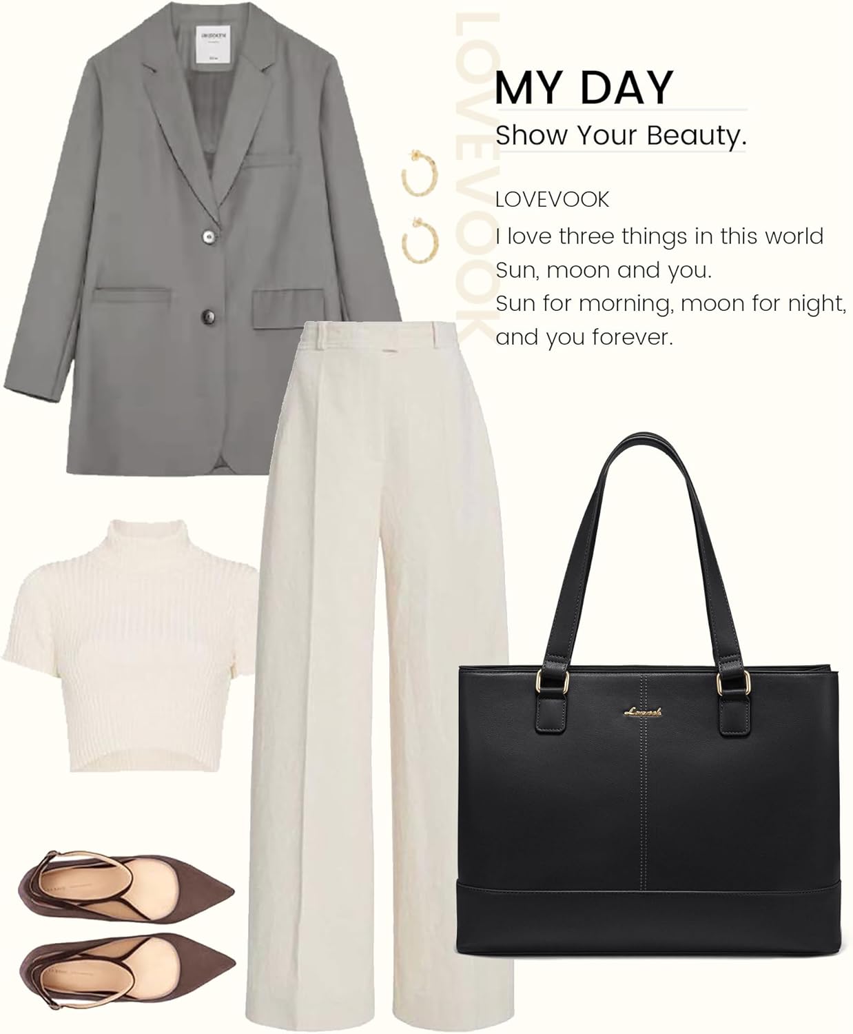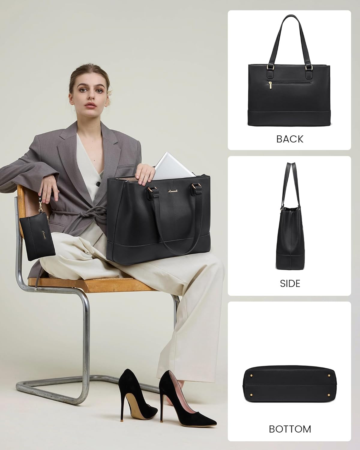 【Large Capacity Work Tote】 Size-16.5 x 5.5 x 12.7 inches, this women's tote offers a generous main compartment, a padded pocket for a 15.6-inch laptop, two slip pockets, and a zippered pocket. It's ideal for storing your iPad, documents, files, headphones, and more, keeping your essentials neatly organized and within reach.