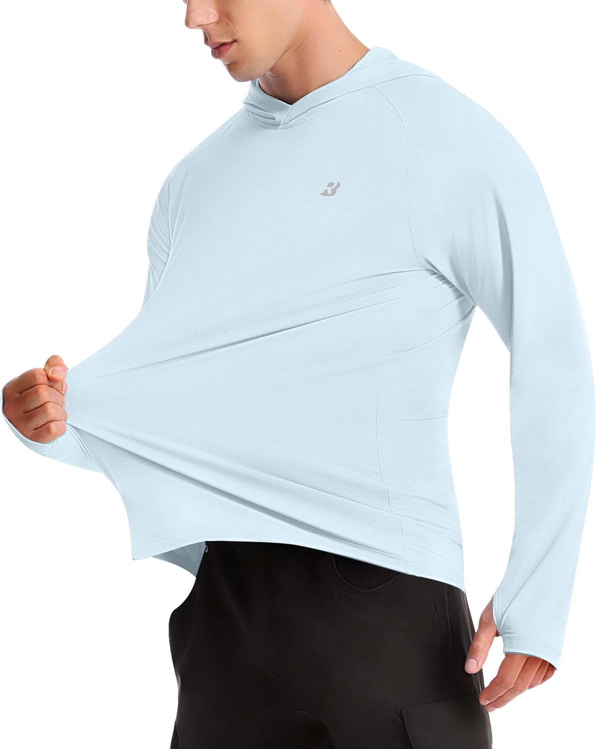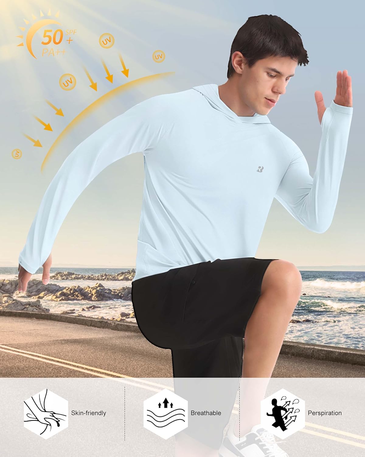 Functional Design: Our UV shirts feature a sun-blocking hood, thumbholes for secure sleeve placement, and a tag-free collar for ultimate comfort; The raglan sleeve design provides extra underarm room, ensuring unrestricted movement; Every detail is crafted to keep you comfortable and ready for action