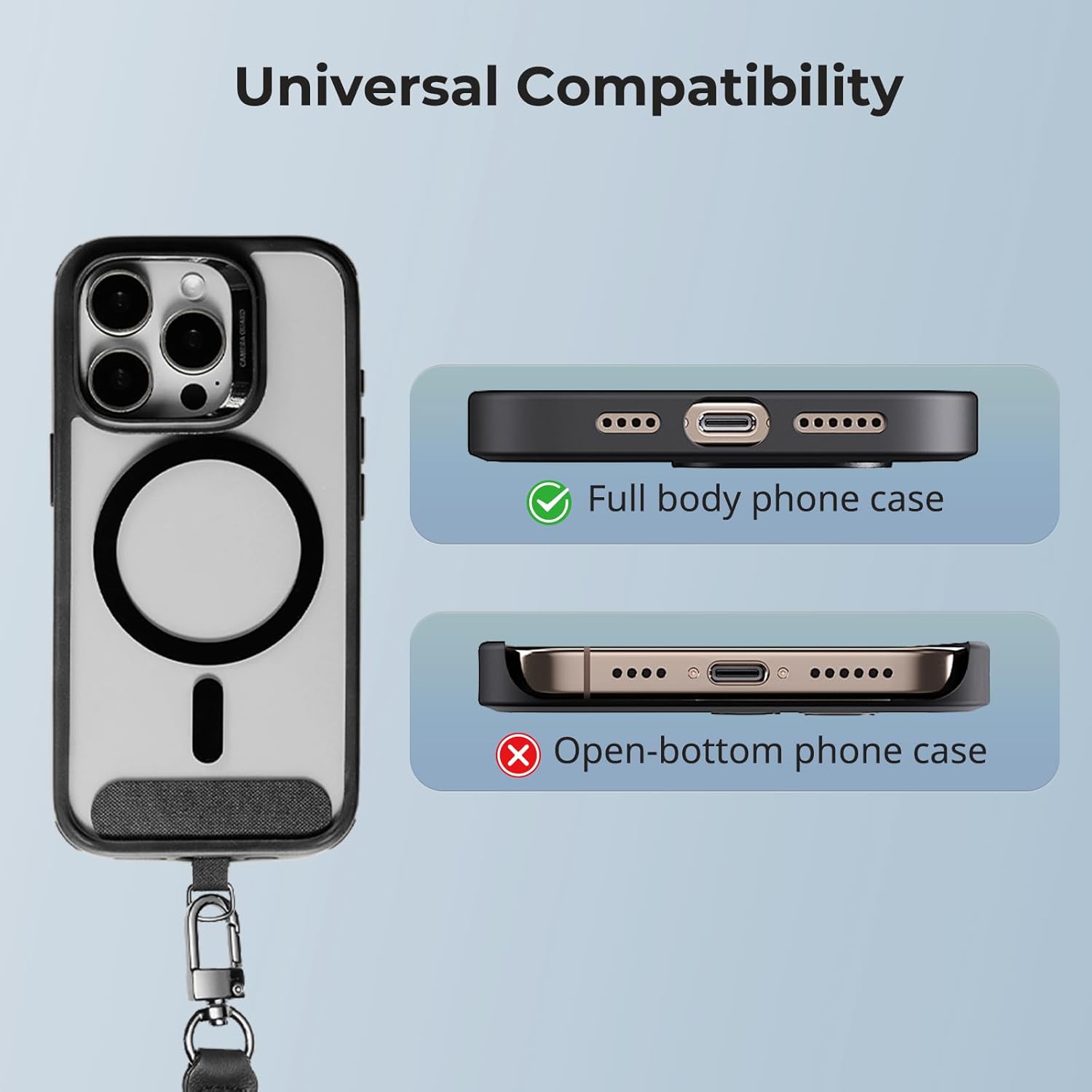 Universal Compatibility: The Phone Shoulder Strap is designed to fit all smartphones, measuring 115 cm (45.28 in) in length and 2 cm (0.79 in) in width. It accommodates full-body phone cases and those with lanyard holes, including popular models like for iPhone, for Samsung Galaxy, for Google, for LG, for huawei, for Xiaomi, and more. Note: Not compatible with half-coverage phone cases.