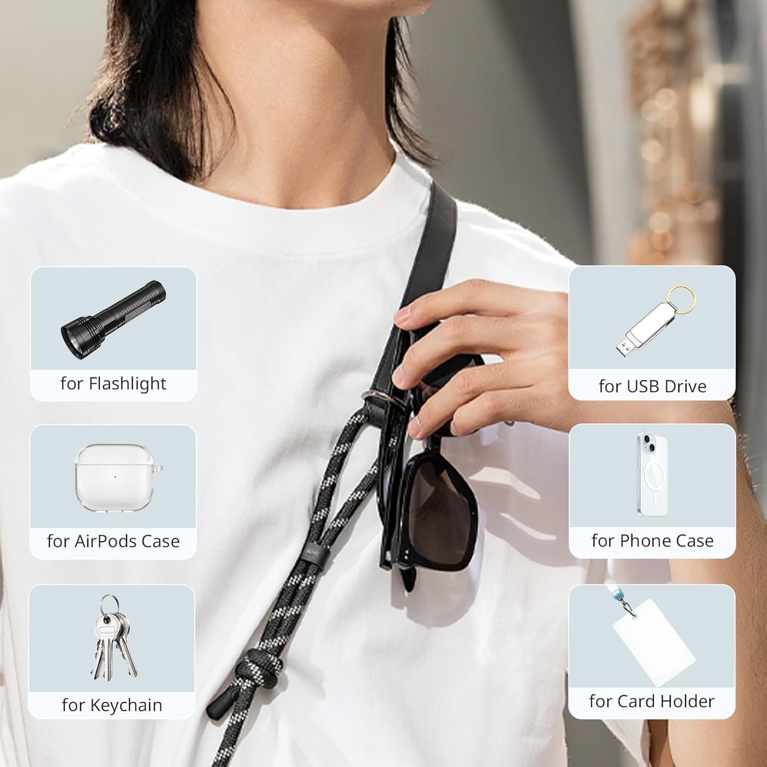 Adjustable & Stylish Design: Featuring a minimalist peruvian knot design, this strap allows for easy length adjustment, enabling versatile wear as a neck or crossbody strap to suit your style. It also includes a built-in metal hook for hanging keys, for AirPods, sunglasses, or charms, keeping your hands free while organizing your essentials. Note: Please do not untie the Peruvian knot.